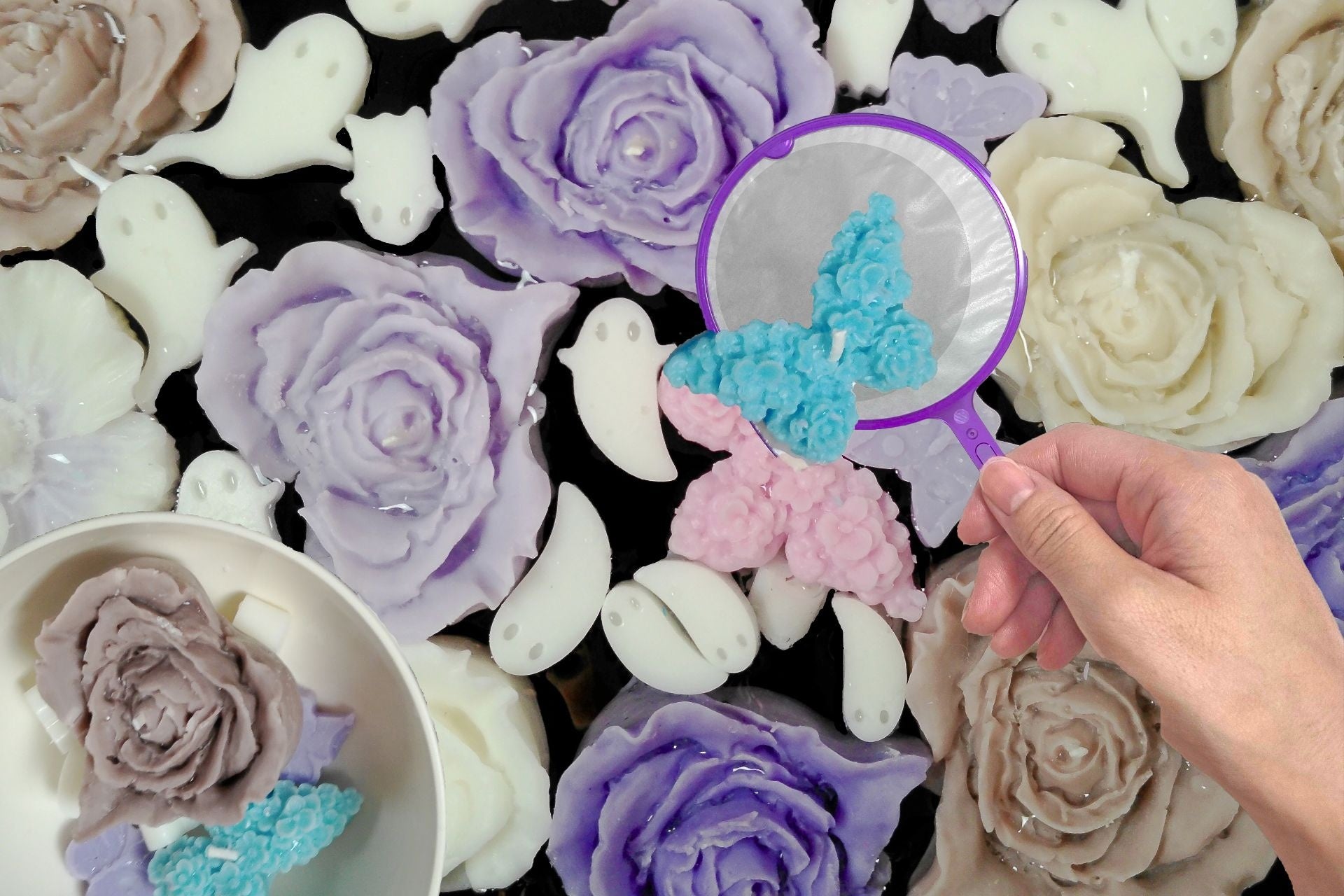 参加者は金魚すくい用の「ポイ」を使って、薔薇や蝶をイメージしたメインキャンドルに加え、おばけやかぼちゃ、お菓子のバケツなど、ハロウィンモチーフのキャンドルをすくうことができます。すくえなくなるまで何度でも挑戦でき、その中からお好きなものを最大10個まで持ち帰りいただけます。
