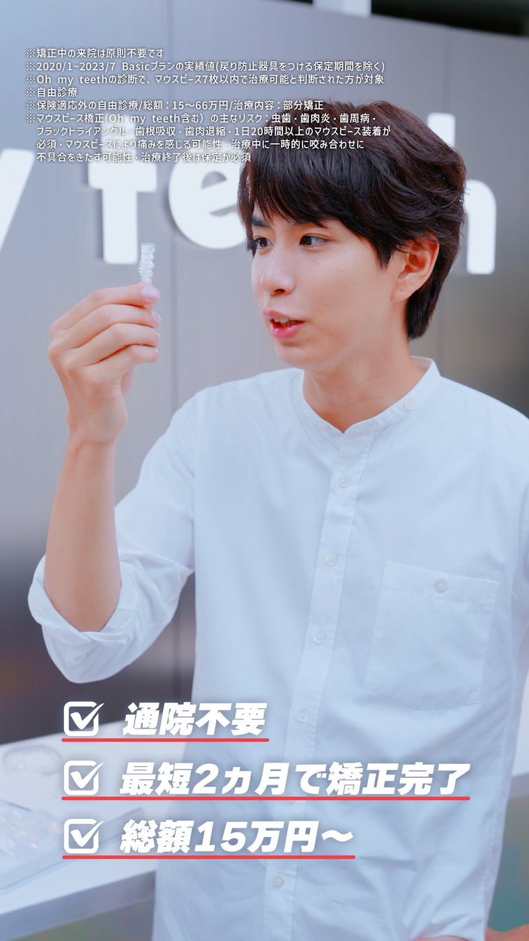 Oh my teethは、通院の手間や高額な費用など、従来の歯科矯正が抱える課題をテクノロジーで解決するマウスピース矯正サービス。初回スキャンを受けたあとは、原則として通院なしで矯正を進められるのが特長です。今回のCMでは、はじめしゃちょーさんの親しみやすいキャラクターと発信力を活かし、歯科矯正に関心を持つ若年層を中心にOh my teethの魅力を伝えることを目指しています。
