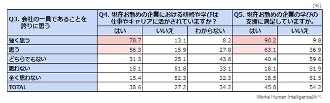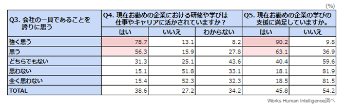 その結果、「現在お勤めの企業における研修や学びは仕事やキャリアに活かされていますか」「現在お勤めの企業の学びを支援に満足していますか」について「はい」と回答した人は「いいえ」と回答した人より、別の設問「会社の一員であることを誇りに思う」に対して「強く思う」「思う」と回答する割合が高くなりました。