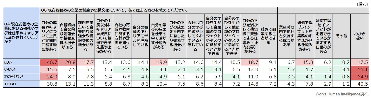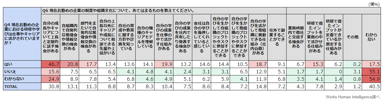 アンケート結果から「現在お勤めの企業における研修や学びは仕事やキャリアに活かされていますか」への回答と「現在お勤めの企業の制度や組織文化について、あてはまるものを教えてください」への回答をクロス集計し、「研修や学びは仕事やキャリアに活かされているという実感」と「企業の制度や組織文化」に相関関係があるかを調べたところ、「学びが仕事やキャリアに活かされている」と感じている人ほど、勤め先の企業に上長と話す機会や勉強会や情報交換の場、学びの成果を仕事の中で活かす仕組み等、学びを活用する制度や組織文化があると回答している割合が高い、という結果が出ています。
