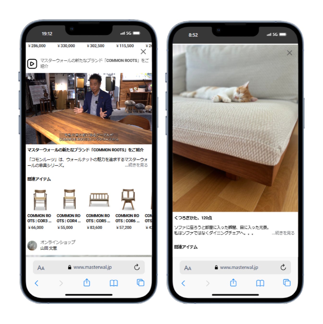 MASTERWALオンラインショップでは、公式や各店舗のInstagramで投稿されている納品事例、UGC、本部・店舗スタッフのsnap投稿、スタイリングのカタログ素材、スタッフによる商品の説明動画や、失敗しない家具選びに関する動画などをvisumoにて収集し、サイト上に展開しています。