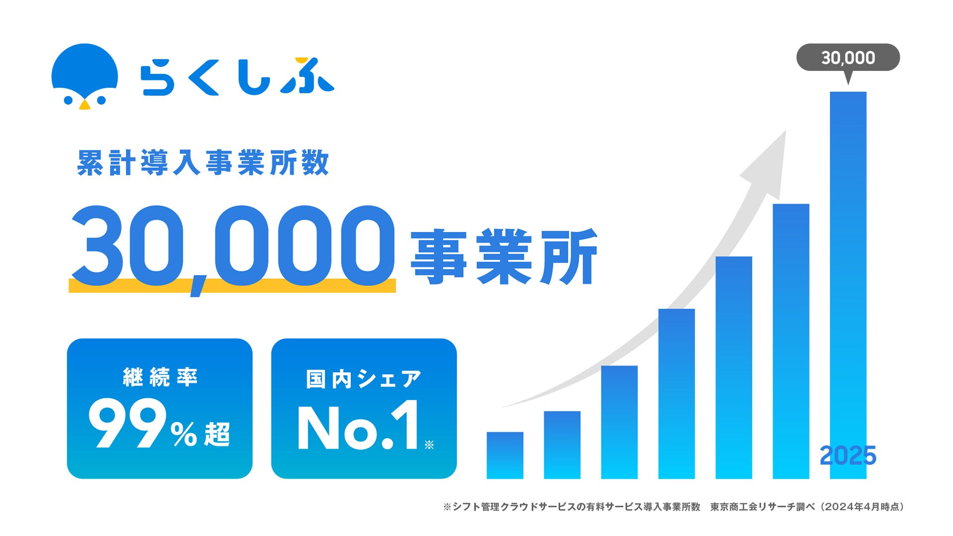 メイン製品であるWorkforce Management「らくしふ」は、様々な業種・業態の事業者様や働き手の方々に長くご愛顧いただくことで、継続率99.4%・導入事業所数30,000事業所(2025年1月23日時点)と国内トップクラスの実績を積み重ねてまいりました。また製品の提供しているソリューションもシフト関連の業務効率化から始まり経営ダッシュボードや職場・働き手の方々の「評価」という領域までへと広がってきています。