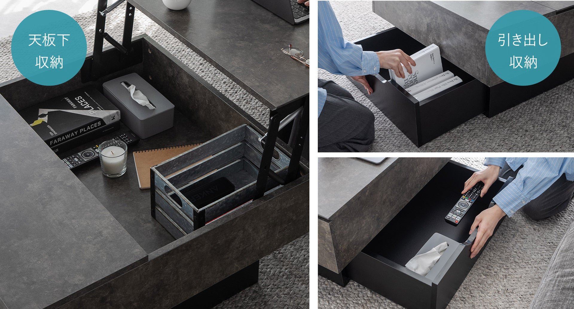 リフトアップすると現れる天板下の広々とした大容量の収納スペース。生活感のある小物をサッと隠せるので、急な来客時も安心です。さらにテーブルの台輪部分には、引き出し収納をプラス。手前・奥どちらからでも出し入れ可能で、デッドスペースを有効活用。引き出しには手を掛けやすい切り欠きを施しており、快適にお使いいただけます。