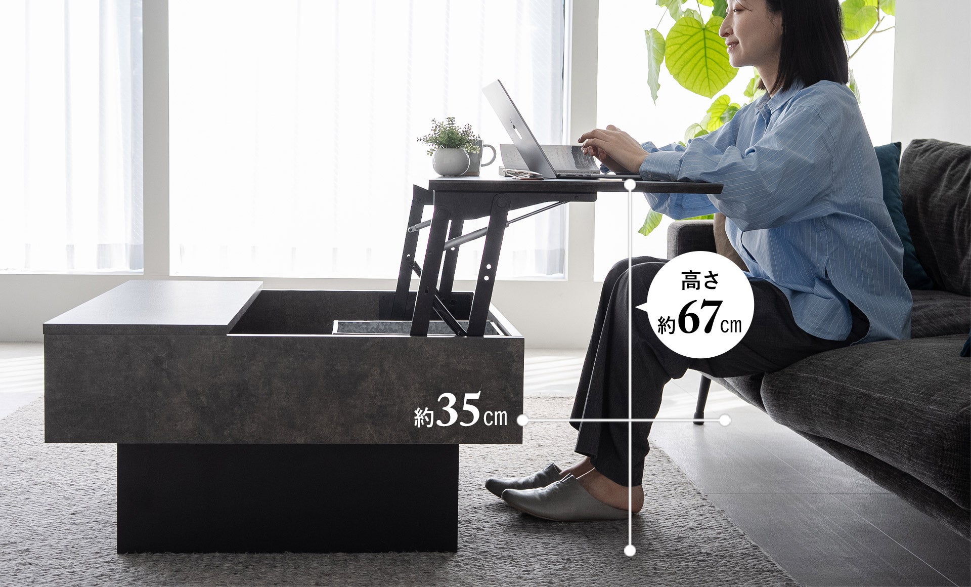 リフトアップ時の高さを徹底検証し、ソファでのPC作業や食事が快適な高さ約67㎝で設計。ソファからの距離や差尺を考慮した「健康姿勢」を追求しました。