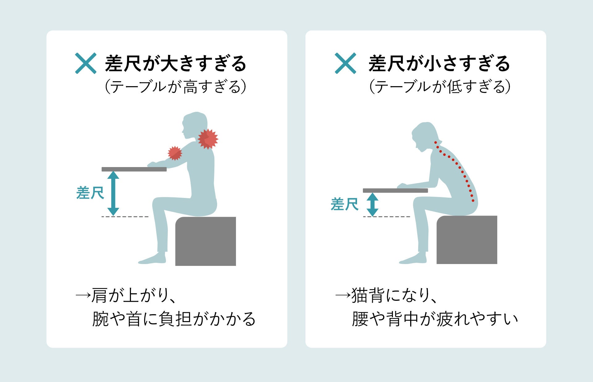 健康的な姿勢を保つには、テーブルと座面の高さのバランス(差尺)が重要です。差尺が大きすぎたり、小さすぎたりすると、腕や首に負担がかかったり、腰や背中が疲れやすくなったりと身体に負担がかかりやすくなります。