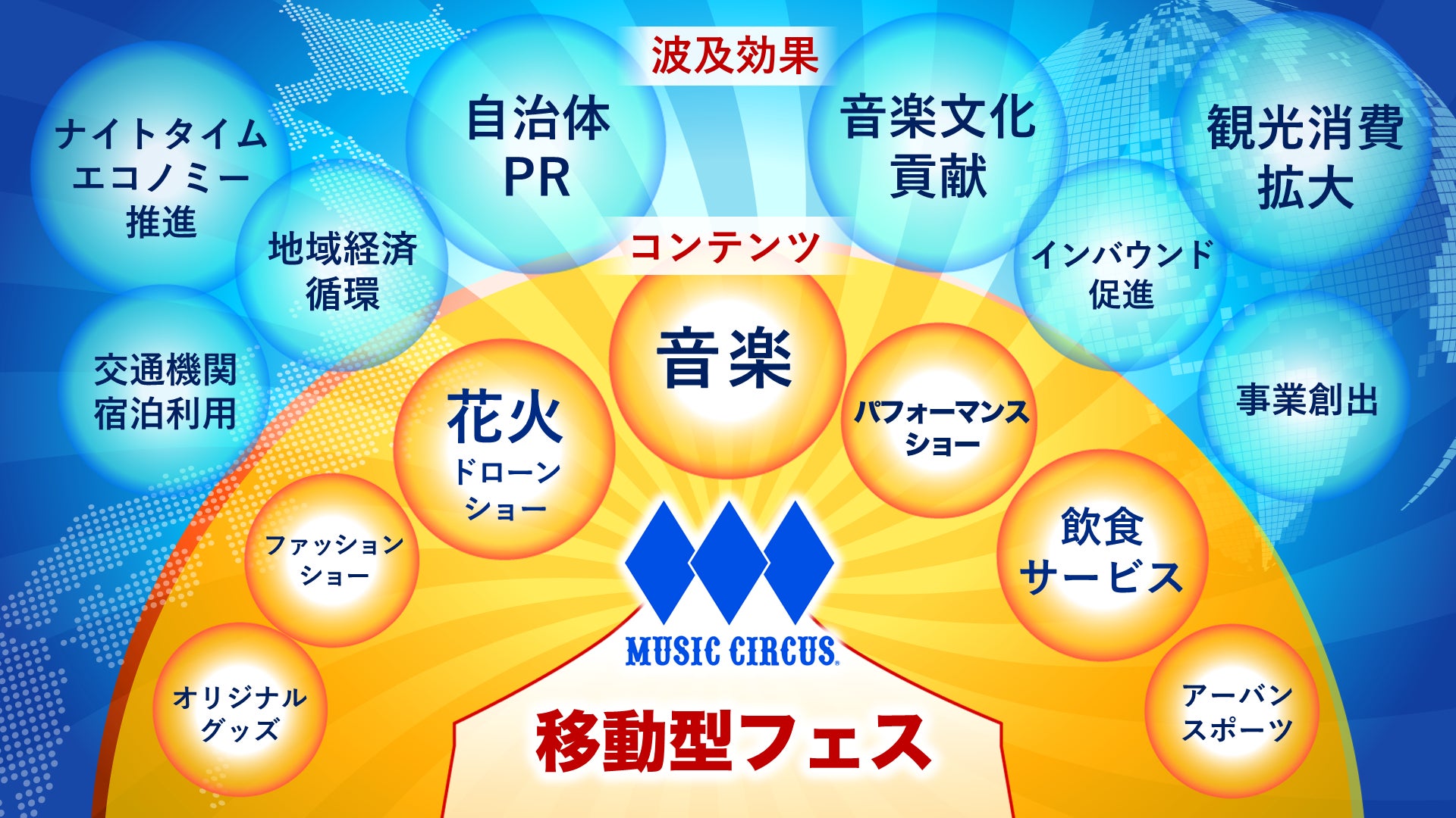 「公益の実現」を目指す両社において、MUSIC CIRCUSは、地域金融機関だけでなく企業や公共団体と直接的に関与することができる魅力的なコンテンツです。これまでの地方創生は、建築物や商店街の再開発など「モノ」を創ることが中心でした。しかし、全国どこにでも、コンテンツまるごと誘致できる「MUSIC CIRCUS」では、国内外から地域に人を呼び込み、リピーターを創り出すことが可能です。音楽×花火×食×ファッション×自然を通じて地元との交流を深め、人々の笑顔と喜びを共有し、地域経済の循環と発展に大きく寄与することが期待されます。