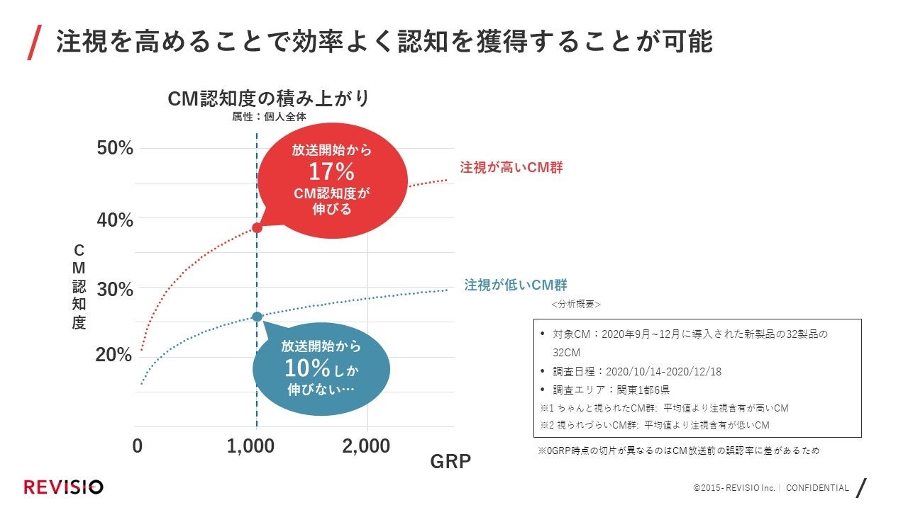 REVISIOの調査では注視を高めることで認知度の獲得に差が生じることがわかっています。