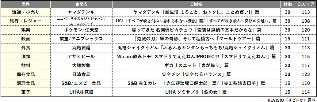 本分析では、テレビCMのクリエイティブを評価するためのREVISIO独自指標「クリエイティブスコア(以下Cスコア)」を用いて、下記条件にあてはまるテレビCMを業界別にランキング化しました。