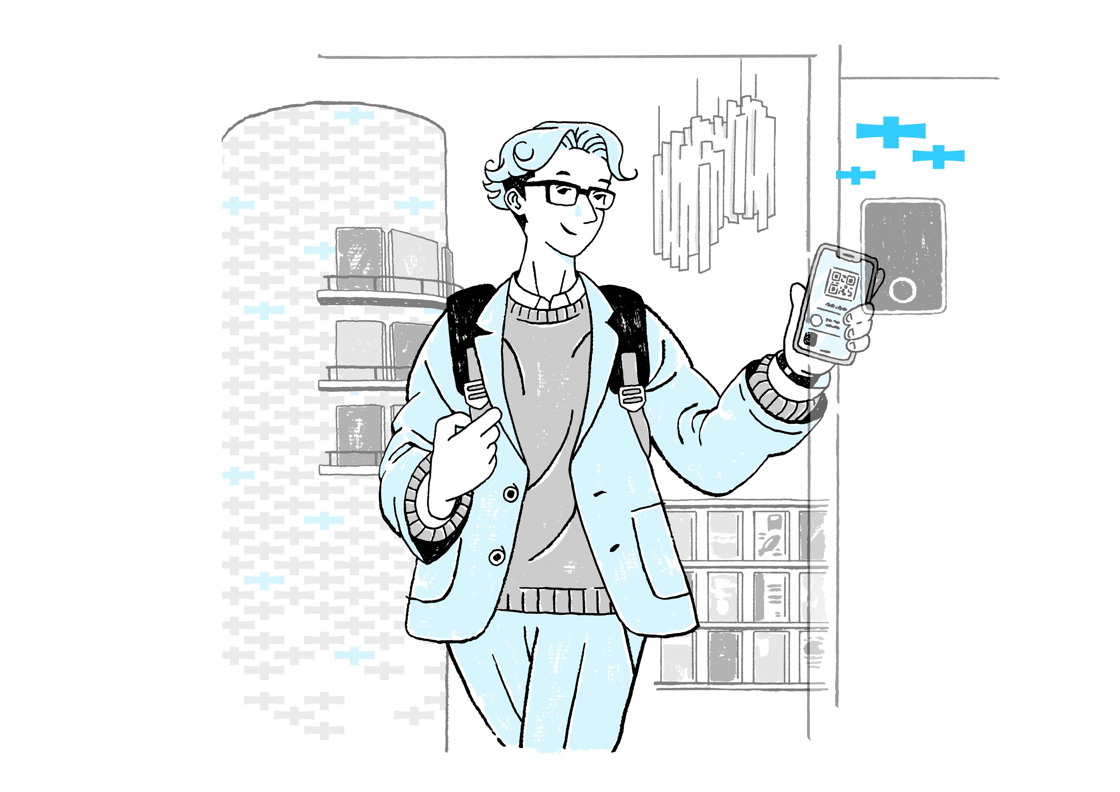 初回は店頭サインのQRコードを読み込んで会員証を発行し、アクセスコントロールシステム「TOBIRA」のリーダーに会員証のQRコードをかざして入店します。