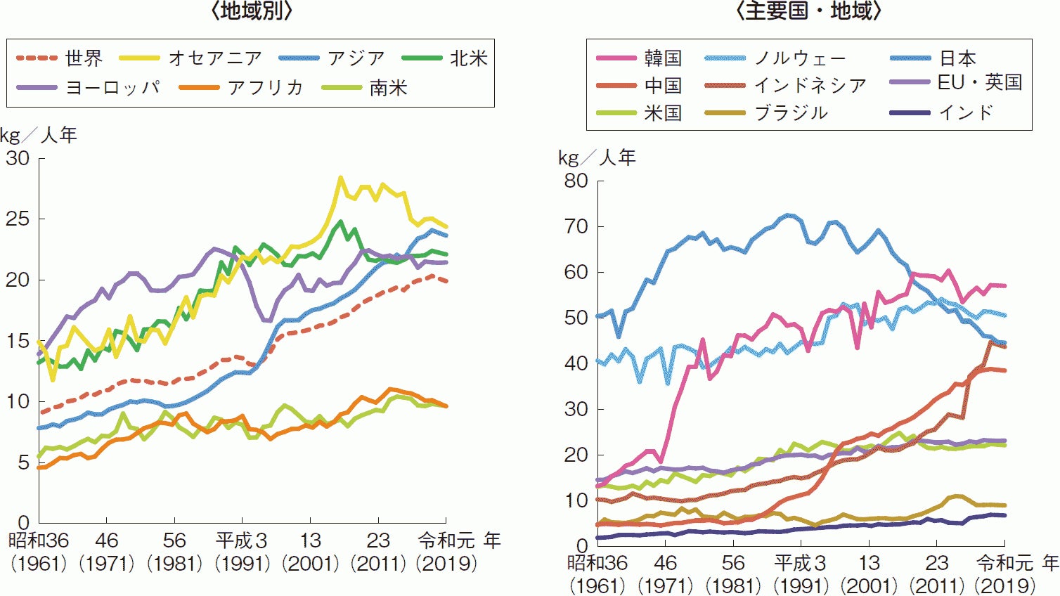 近年の調査によると、我が国における魚の消費量は年々減少しています。それでも1人1年当たりの食用魚介類の消費量は、世界平均の2倍を上回って推移しており、日本だけ消費量が減少するという世界でも例外的な動きをしています。