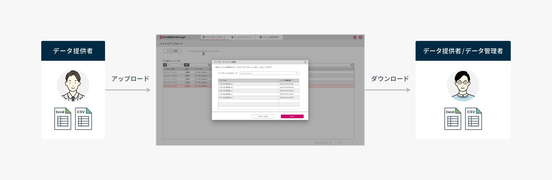 データ提供者は、ブラウザ上からExcel・CSVファイルのアップロードを行うことで、データ管理者が設定したデータパイプライン構築の定義に沿ったインポート処理が行われ、その実行結果を確認できます。