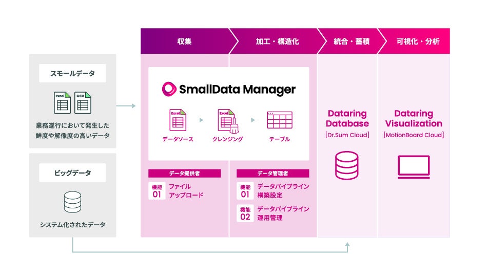 新たに提供する「Dataring SmallData Manager」は、既に利用しているシステムや業務の運用を変更せずに、このようなスモールデータを収集のプロセスを簡易化し、バリデーション処理やクレンジング処理を自動実行します。データマネジメントサービス「Dataring」の分析基盤に投入することで、システム化のコスト削減だけではなく、基幹システムや業務システムで生成される実績値等のデータと、計画値等の未来のデータを組み合わせたデータ分析環境を実現します。