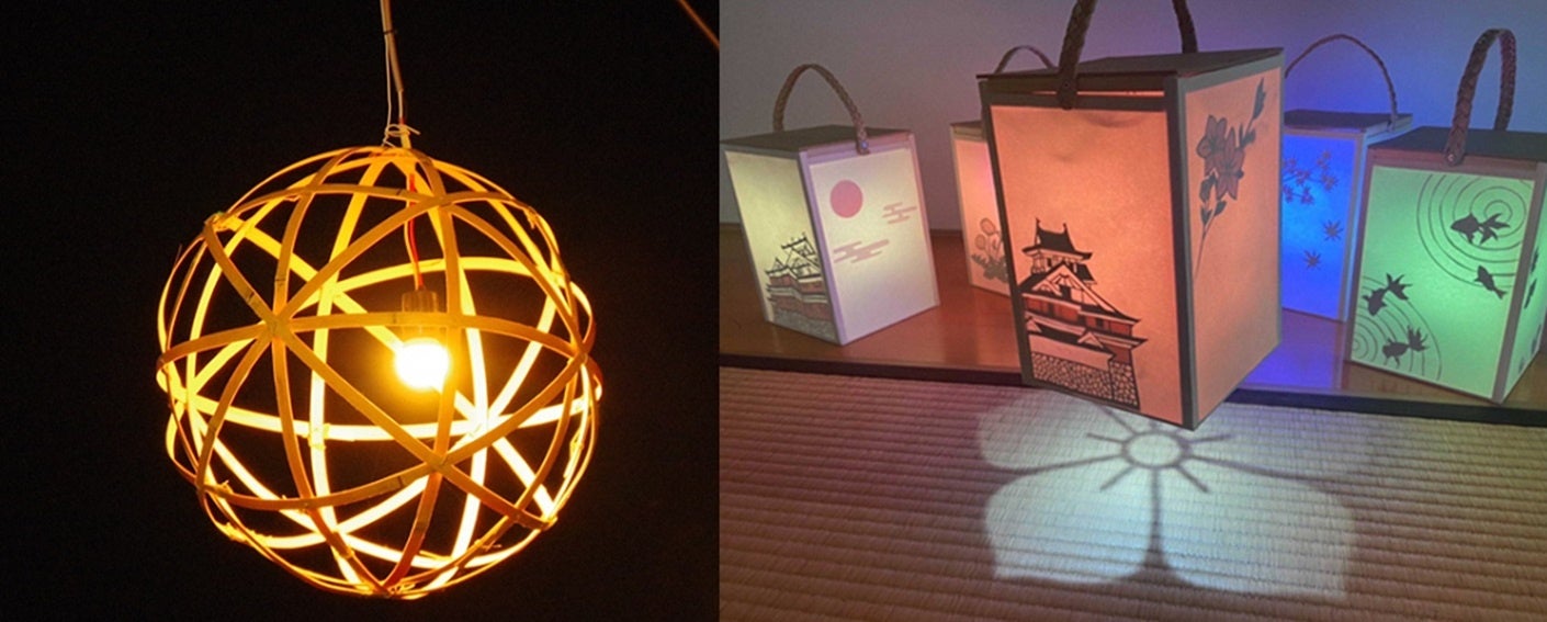 会場入り口では、福知山市内で行った竹ワークショップで制作された「竹まり行燈」を無料で貸し出します。また、昨年度も好評だった、福知山公立大学の、桔梗の家紋を映し出す「手持ち行燈」もご用意しています。行燈を持って、光のアートに参加してみてください。