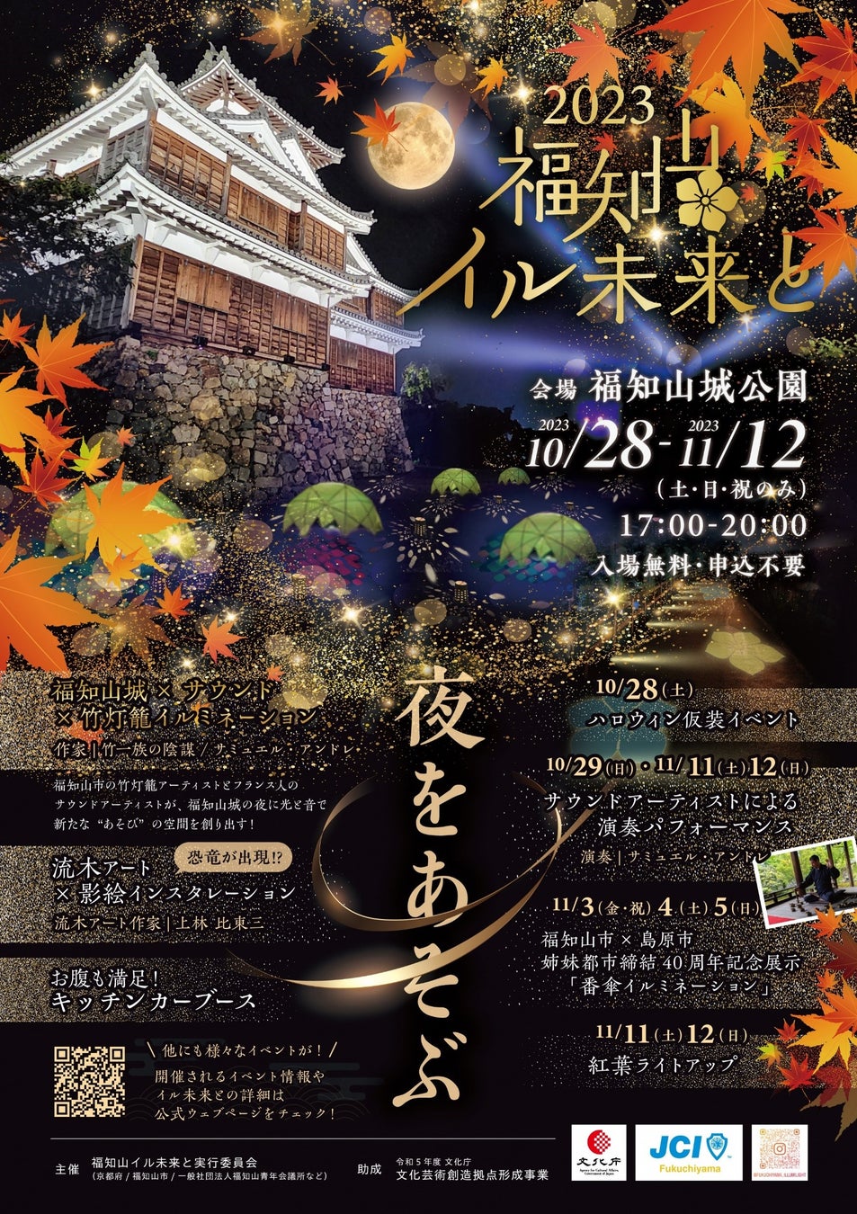 2023年度は「夜をあそぶ」をテーマに、メイン展示となる京都府在住アーティストたちによる福知山城×サウンド×竹灯籠イルミネーションのほか、流木アート×影絵のインスタレーションやキッチンカーブースも設置し福知山城の夜に光と音で新たな“あそび”の空間をつくります。