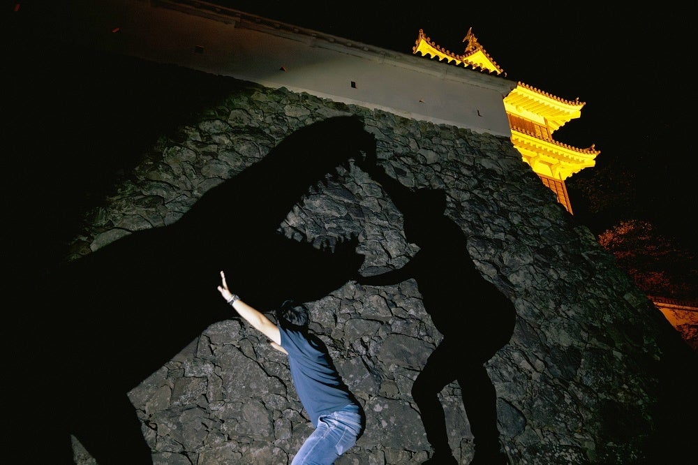 舞鶴市在住のアーティスト・上林比東三による流木アートが、福知山城の城壁に“巨大影絵”を出現させます。流木アートの影に自分の影も加えると、どんな影絵ができるでしょうか。影絵だけでなく、タイトルをつけたり、影絵と撮影してみたり、福知山城×影で思いっきり“あそんで”みてください。