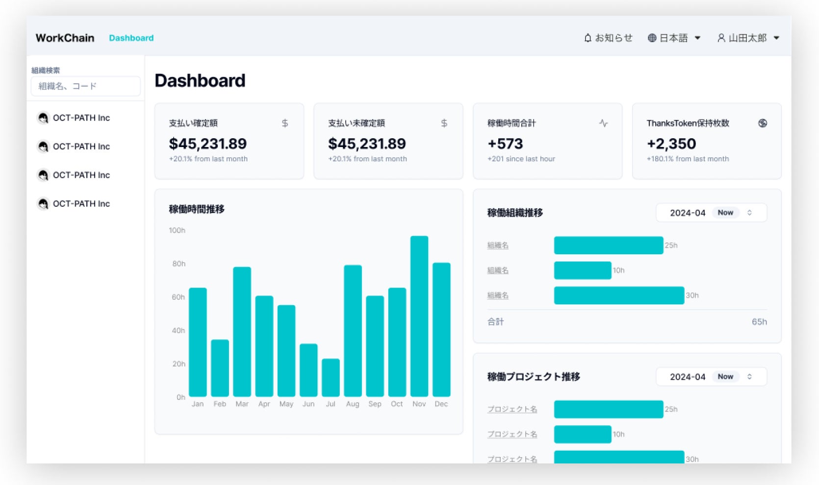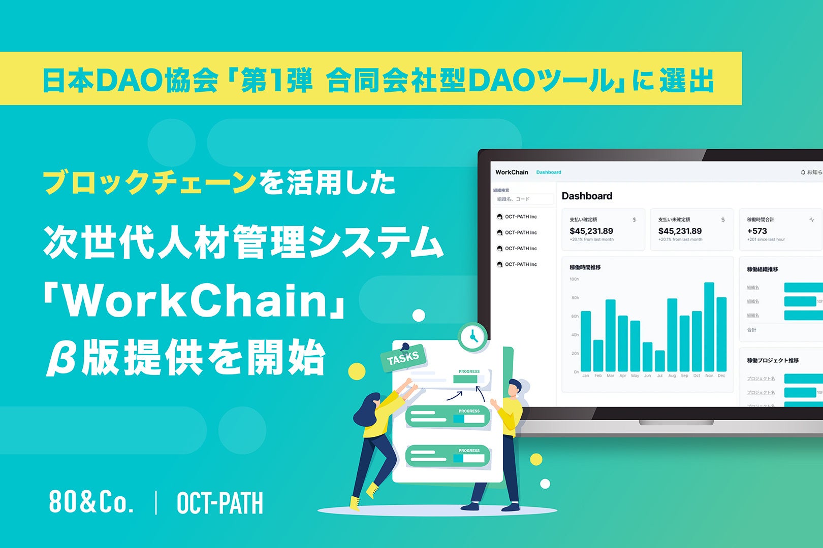 株式会社80&Company(本社:京都市左京区、代表取締役:堀池 広樹)の関連会社である株式会社OCT-PATH(本社:沖縄県那覇市、代表取締役:多田雄策)は、ブロックチェーンを活用した人材管理システム「WorkChain」を開発し、インドネシアラボ型オフショア開発サービスにおいてβ版提供を開始しました。「WorkChain」は、業務委託メンバーが多いチームやDAO型組織などでの稼働管理を、簡単かつ信頼性・透明性高く実現します。
