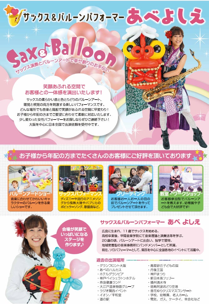関西を中心に全国各地で活躍する大道芸人「サックス&バルーンパフォーマーあべよしえ」による、笑顔あふれる楽しいパフォーマンスをお届けいたします。