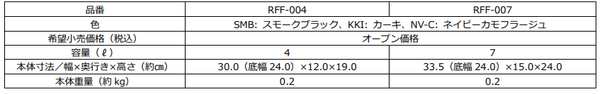 サイズは、4Lと7Lの2種。4Lサイズ(RFF-004)は、お弁当と飲みものなどをコンパクトに持ち運びたいときに最適なサイズです。7Lサイズ(RFF-007)は、500mlのペットボトルが縦に入る高さで、マチが広いため幅のあるお弁当入れやすいサイズです。カラーはシンプルなスモークブラックとカーキ、他製品でも人気の高い迷彩柄を取り入れたネイビーカモフラージュの全3種です。