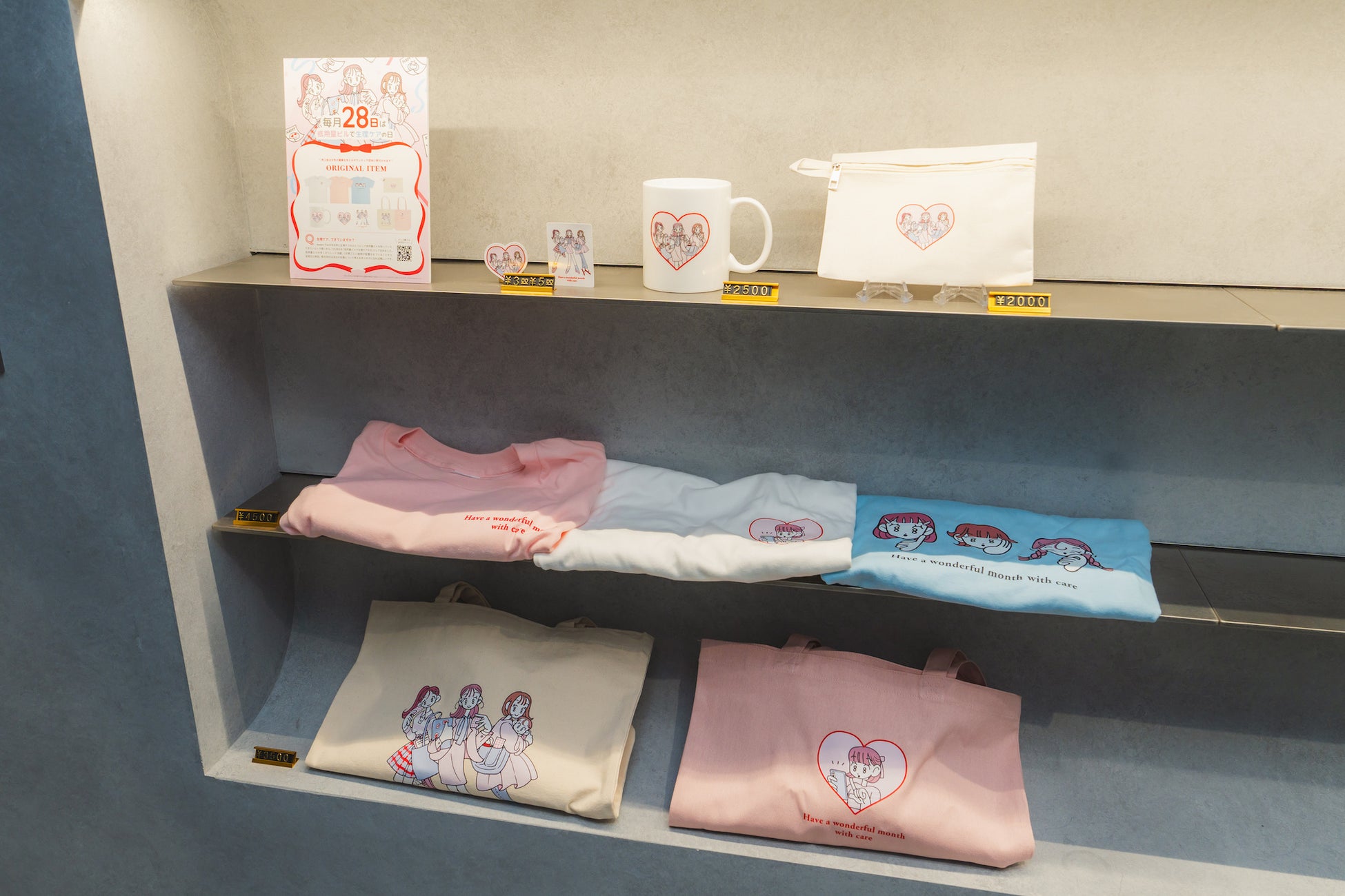 『低用量ピルで生理ケアの日』特設サイトで販売中のオリジナルグッズも、店頭にて展示・販売します。記念日キャラクターをメインモチーフに、Tシャツ・トートバッグ・マグカップなどのライフスタイルグッズを揃え、CHOOSEBASE SHIBUYAのオンラインストアでの購入も可能となっています。オリジナルグッズの売上金による収益は、国際協力NGO『ジョイセフ(JOICFP)』に寄付することで、世界の女性の命と健康を守るための活動を支援します。