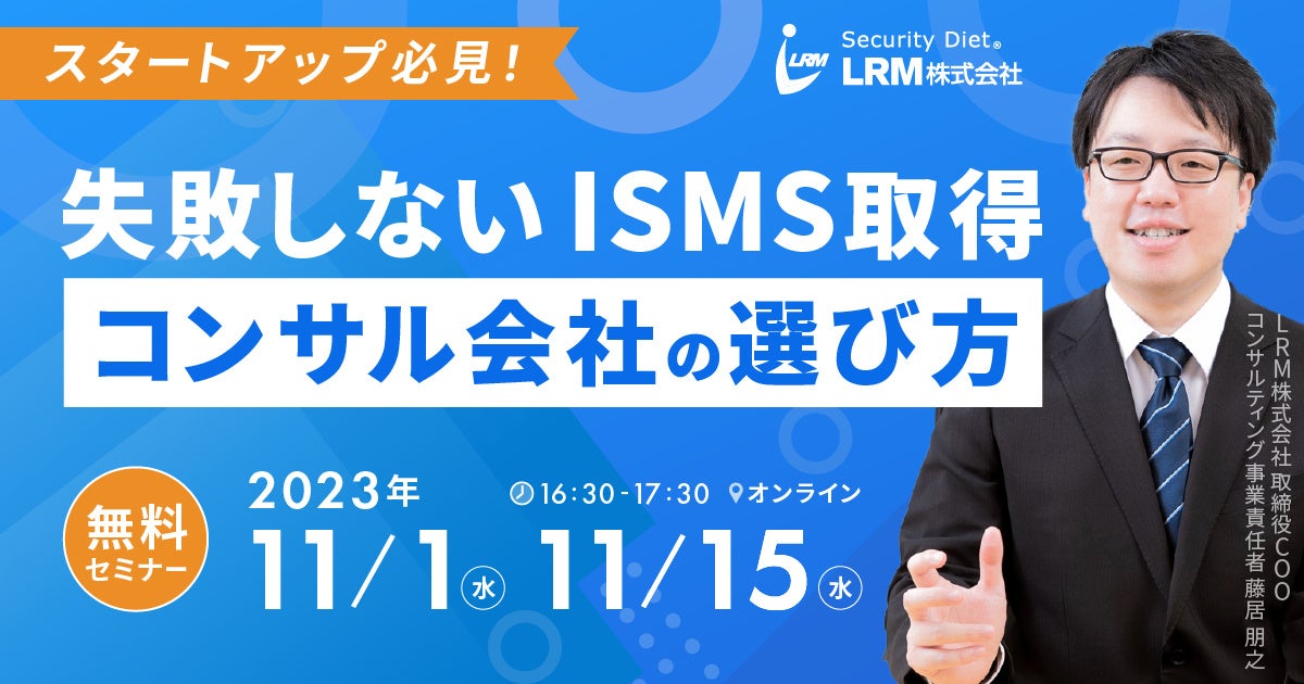 そこで今回、スタートアップ企業やITベンチャー企業を数多く支援してきた知見を活かし、ISMS認証取得の基礎知識はもちろん、失敗しないISMS取得コンサル会社の選び方を分かりやすく解説したセミナーを開催いたします。コンサル会社を比較する際の着眼点や、スタートアップ企業がISMS認証取得において気を付けるべき点もご紹介します。ぜひ、自社のISMS認証取得やセキュリティ対策にお役立てください。