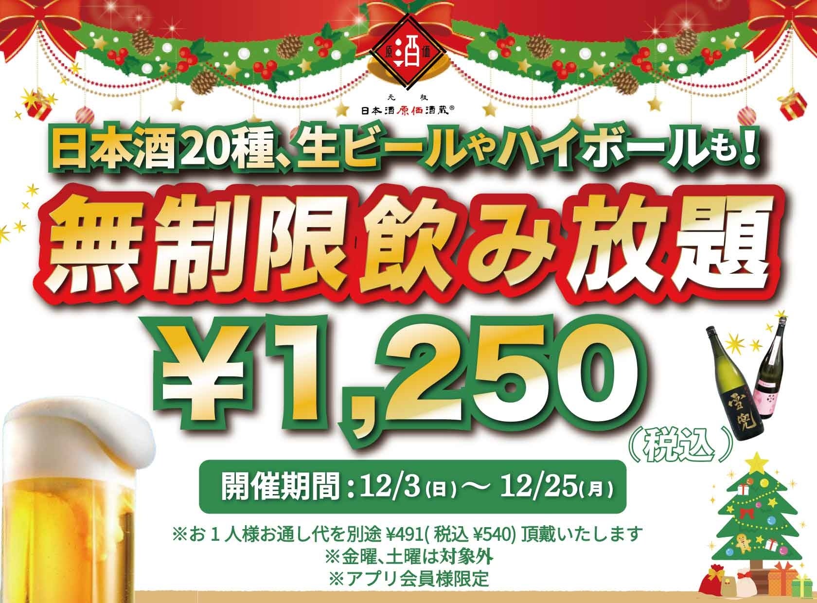 12月3日(日)~12月25日(月)に日本酒原価酒蔵にて時間無制限飲み放題¥1,250(税込)を開催します。
