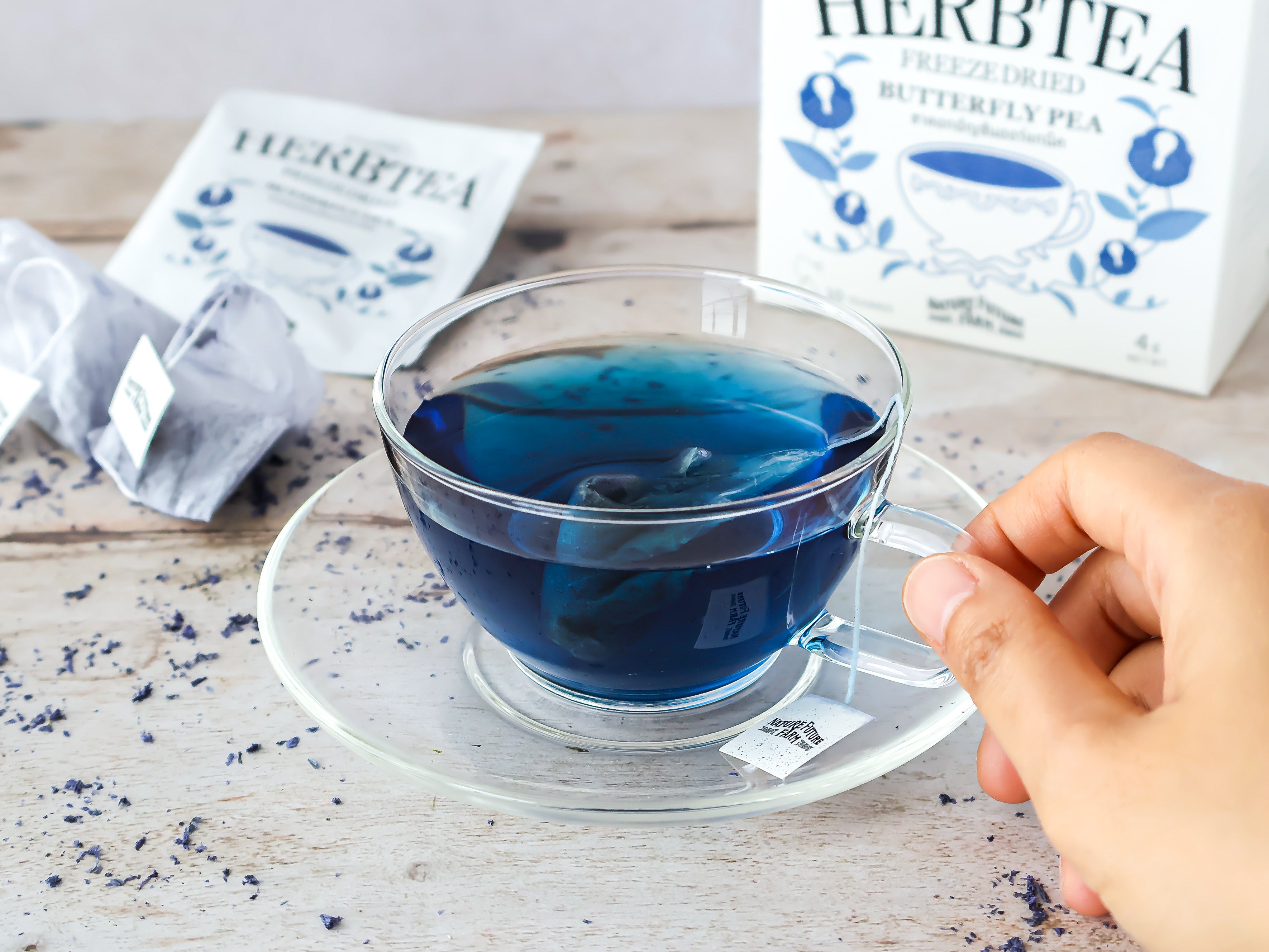 バタフライピーは、タイを中心にハーブティーや料理などで親しまれている、濃い青色の花を持つマメ科の植物です。ほのかな豆の香りが特徴で、水やお湯を注ぐと、タイの美しい海を思わせる透き通るブルーの色があらわれます。またレモン汁などのクエン酸を加えると、化学反応で青色から紫色、そして桃色に変化。気分によって、味や色を変えてお楽しみください。