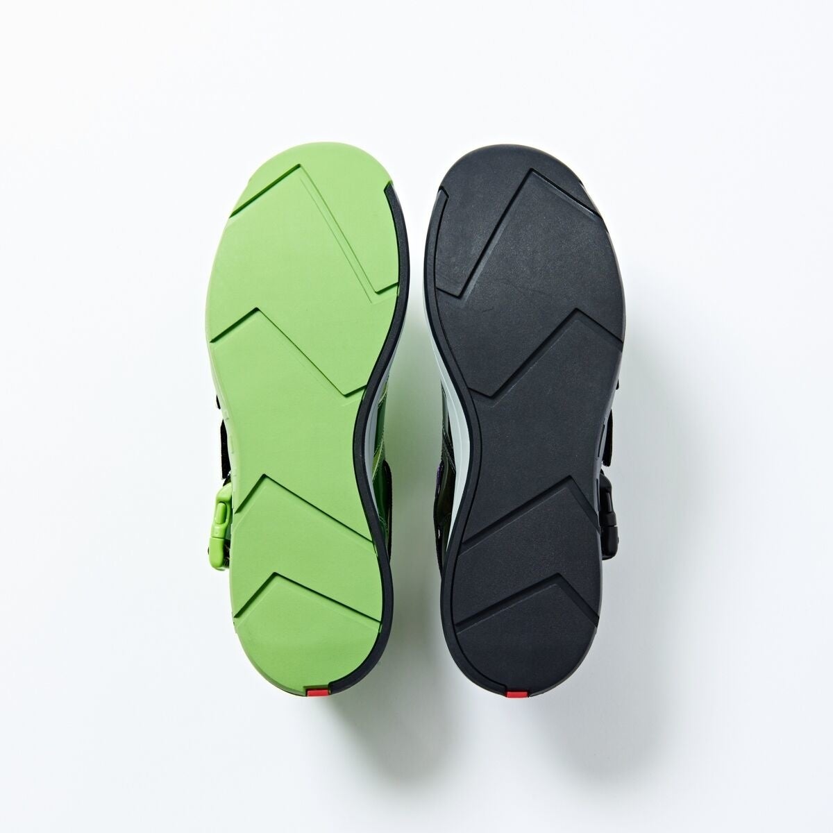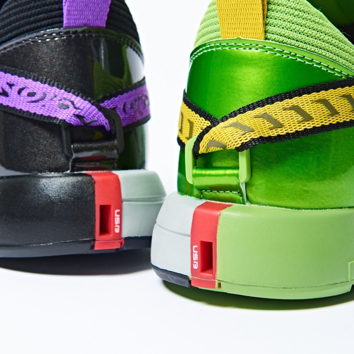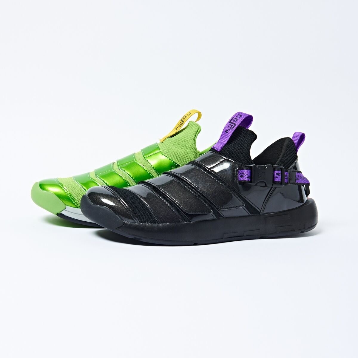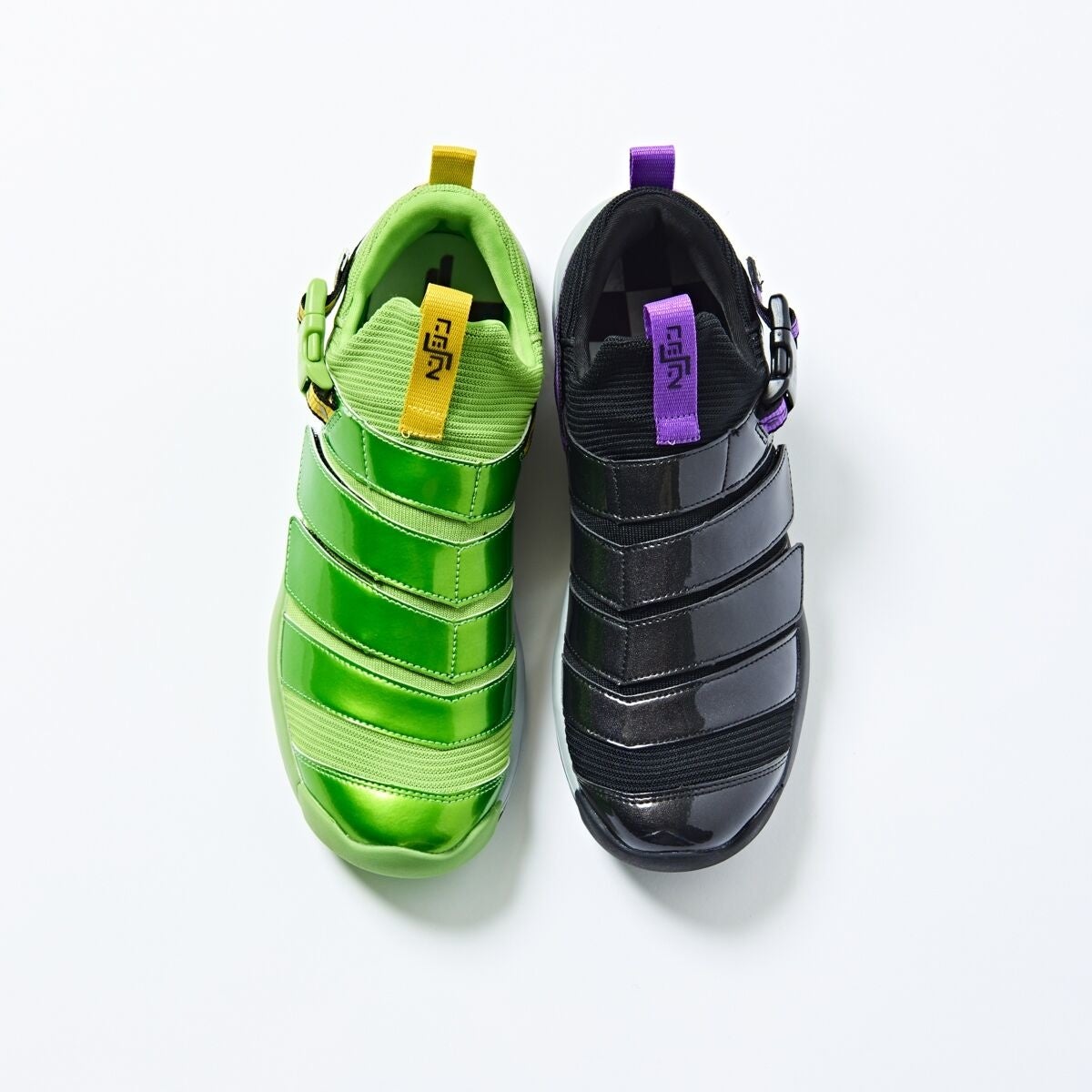 2人で1人の仮面ライダーをオマージュした、ミスマッチスニーカーは、ニットアッパーに光沢のある素材を巻き付ける事で、仮面ライダーWの体のラインを表現しています。スニーカーを並べてヒールから見ると仮面ライダーWの胸のラインが表現されたり、ソールを合わせるとロゴが繋がって見えたりと、左右のスニーカーの組み換えでタウンユースにも遊びの幅が広がるアイテムとなっています。インナーソールには、街を守る2人で1人の仮面ライダーの思考の部屋がそれぞれデザインされています。