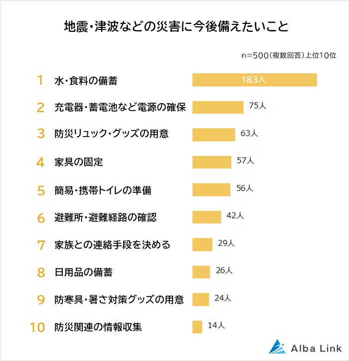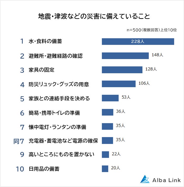 株式会社AlbaLink(本社:東京都江東区、代表取締役:河田 憲二)は、全国の男女500人を対象に「地震・津波などの災害に備えていることに関する意識調査」を実施し、そのデータをランキングにしました。