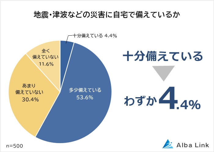 今回、株式会社AlbaLink( https://albalink.co.jp/ )が運営する訳あり物件買取プロ( https://wakearipro.com/ )は、全国の男女500人を対象に「地震・津波などの災害に備えていること」についてアンケート調査を実施しました。