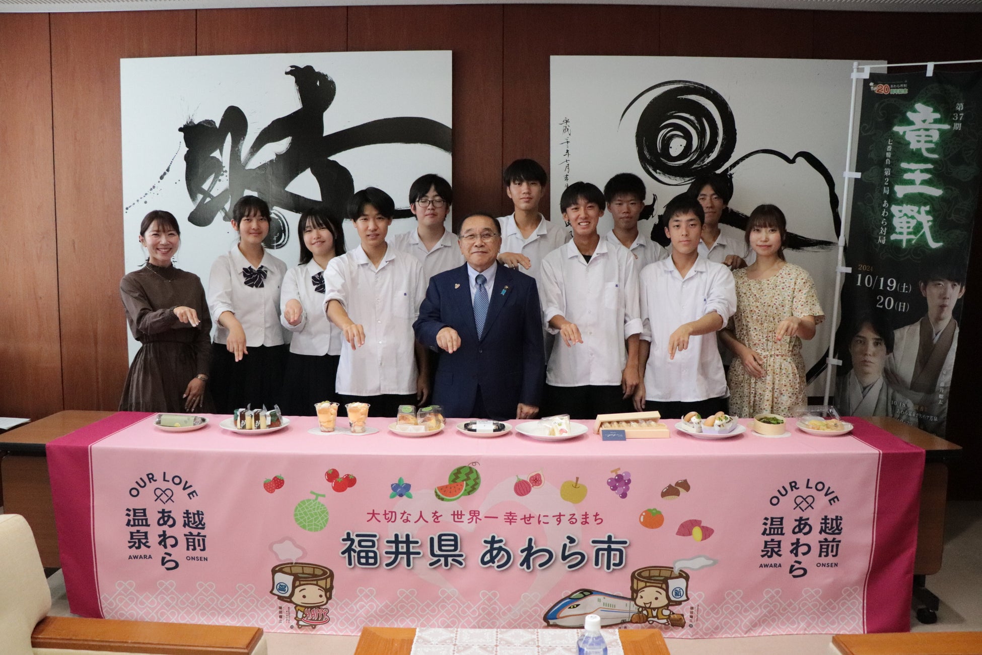 竜王戦あわら対局に先駆けて、金津高校生とインフルエンサーが集結し、棋士たちが食べる「勝負おやつ」の試食会が、10月18日あわら市役所で開催されました。地元あわら市の食材をふんだんに使用した12品のおやつが高校生たちの視点でPRされ、あわらの食の魅力が広く発信されました。