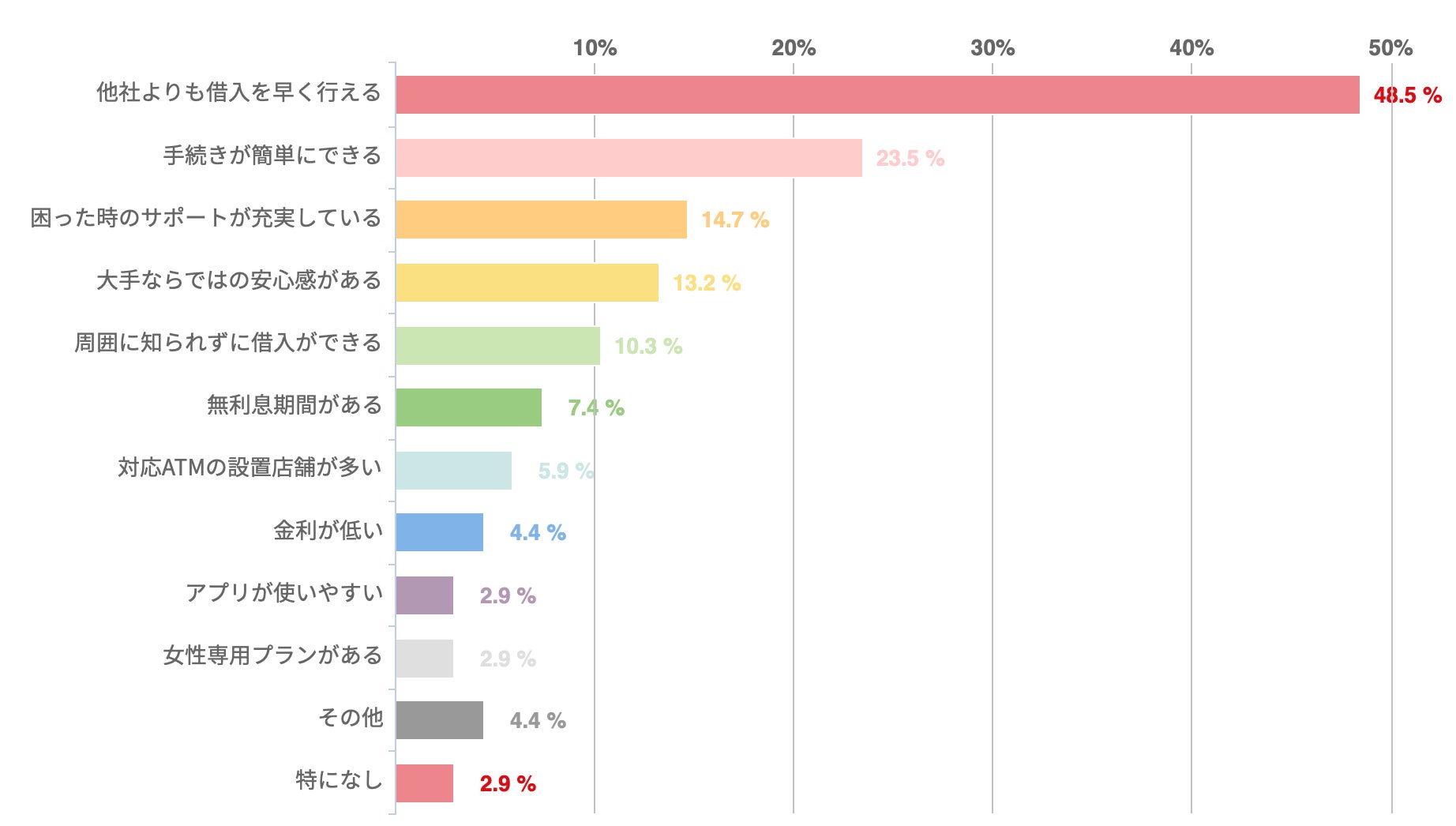 アンケートによれば、他社と比較したアイフルのメリットとしては、「借入までのスピードが早い(48.5%)」点が最も多く挙げられた。