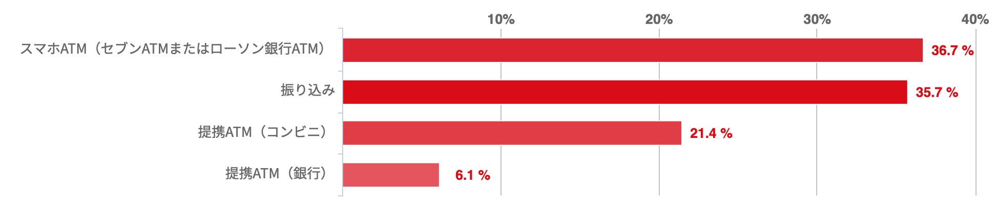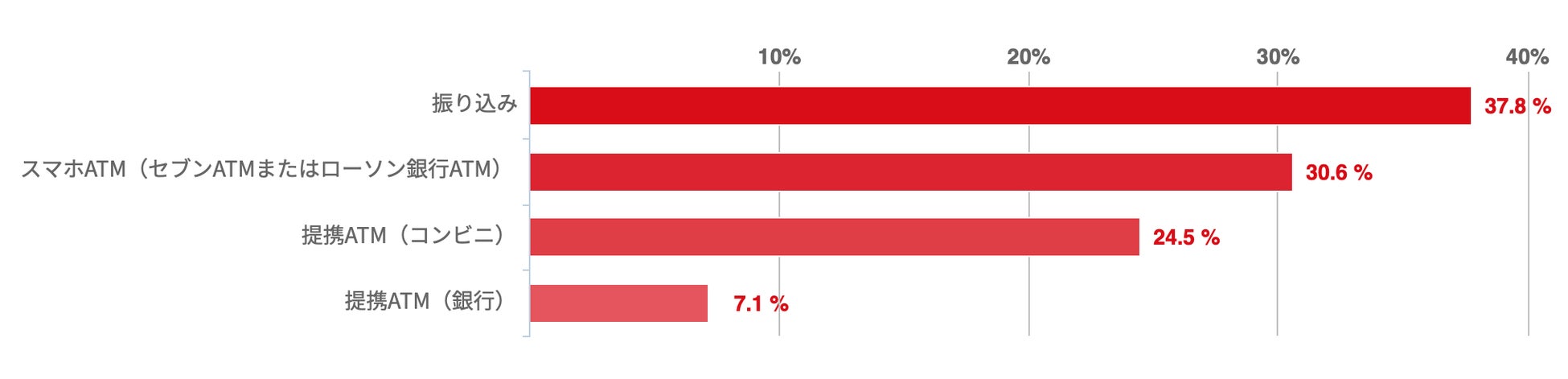 最も多く選ばれたのは「振り込み(37.8%)」であり、そこから「スマホATM(30.6%)」と「コンビニATM(24.5%)」が続く形となった。