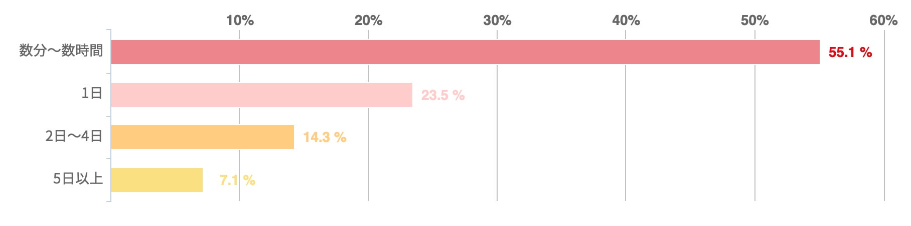 具体的には、「数分〜数時間で受け取った」という回答者が55.1%で過半数を超えていた。特に、「1時間〜2時間くらいで口座に振り込まれていた」という回答が目立ち、アイフルが利用者への支払を迅速に完了させている様子が伺える。