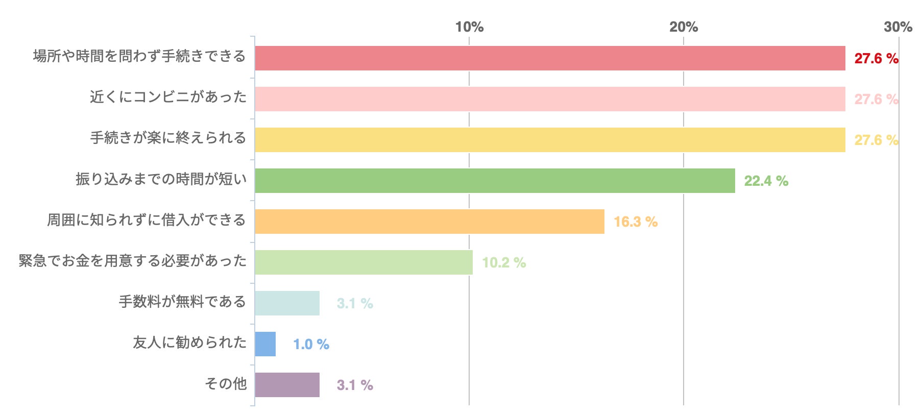 アイフルでの借入方法として最も選ばれているのは、「振り込み(37.8%)」であり、ユーザーから推奨されているのは「スマホATM(36.7%)」であった。スマホATMは口座登録を行う必要がなく、近くのコンビニからすぐに借入できる点が評価されているのだろう。また、それぞれの借入方法を選んだ理由として「場所や時間を問わず手続きができる(27.6%)」点や「手続きが簡単に行える(27.6%)」が多かったことから、ユーザーの利便性を重視する傾向が読み取れる。