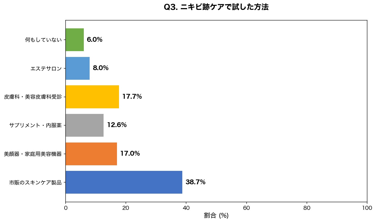 設問:ニキビ跡改善のためにこれまで試したことがあるものを選んでください(複数回答可・最も効果を期待したもの1つ)