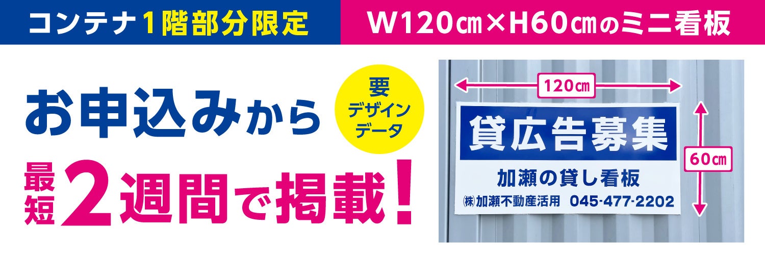 株式会社加瀬不動産活用(所在地:神奈川県横浜市、代表取締役:谷間広視)は、気軽にスタートが可能な新サービス「加瀬のミニ看板」を11月28日に開始します。地元企業や個人広告主のピンポイントのプロモーションニーズに応える本新規事業は、加瀬のレンタルボックスのコンテナ1階部分に限定して低価格での看板掲載を可能にするものです。