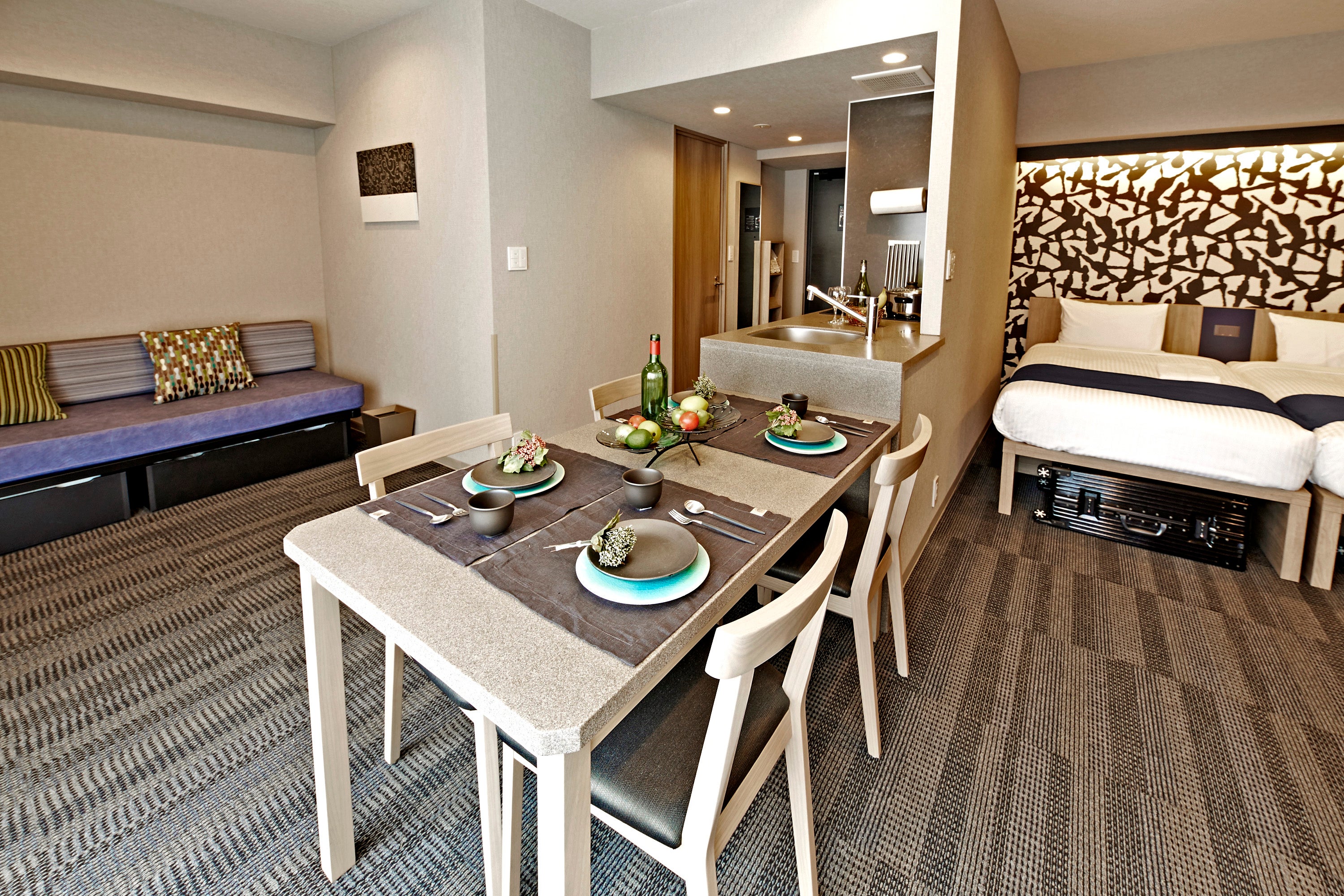 シンプルかつ機能的でありながら日本の美意識を生かした客室や、自炊可能なキッチンや洗濯乾燥機をはじめとした長期滞在者向けの設備など、お客様の快適な滞在を叶えるためのサービスを取り揃えています。