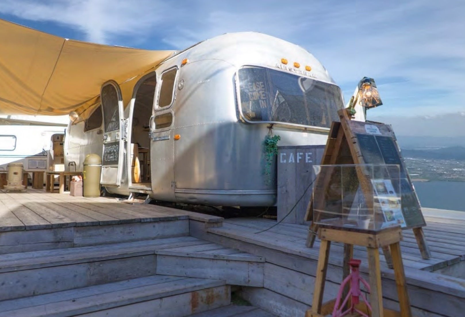 Café360のカフェは銀色のトレーラー型のシンボリックな形で、カフェ限定の名物である6つのフレーバーのドーナッツは1日100個以上の売れる商品のほか、びわ湖テラスオリジナルの近江茶・和紅茶、地元でとれる希少な果実「アドベリー」を使用した地ビールなど、この景色で楽しめるメニューをそろえております。