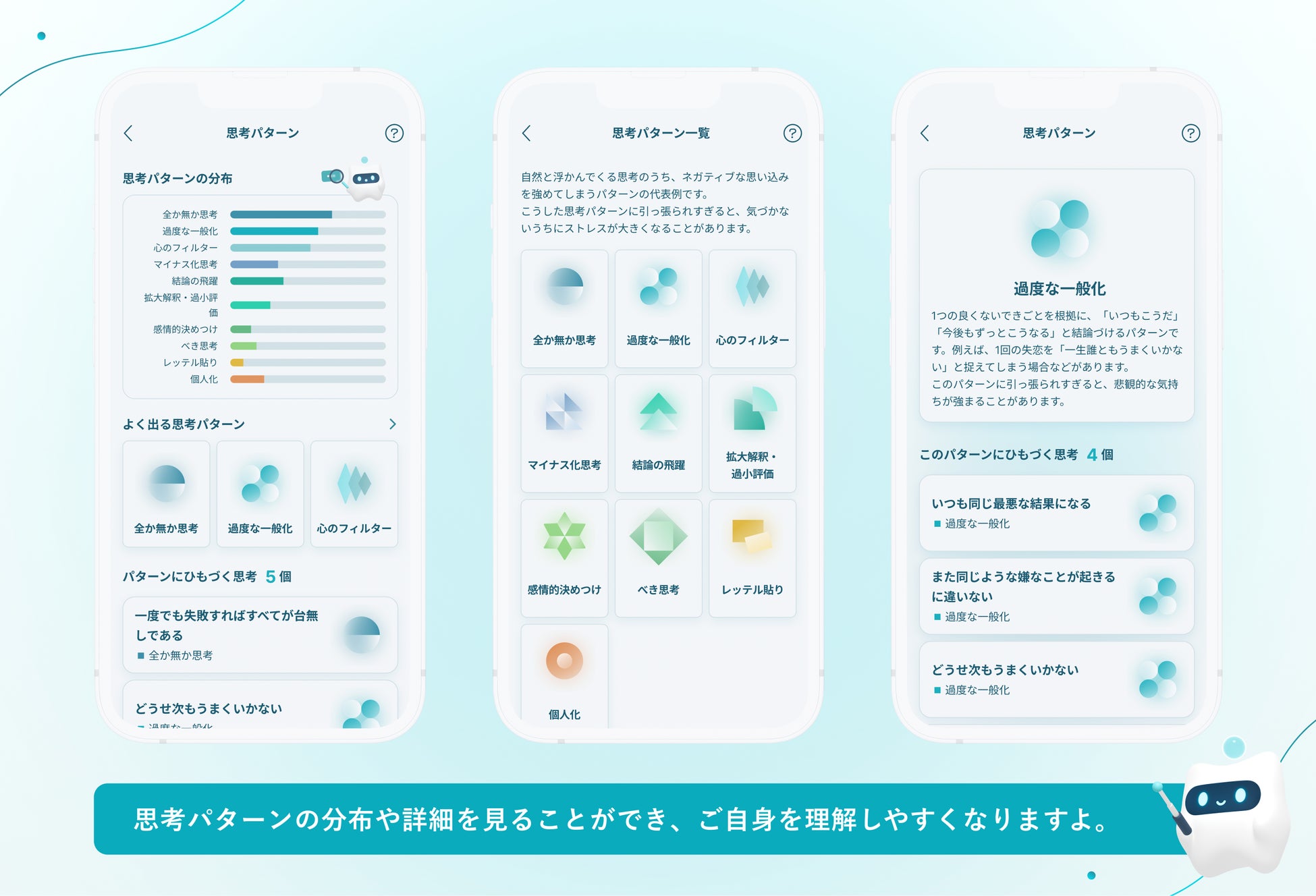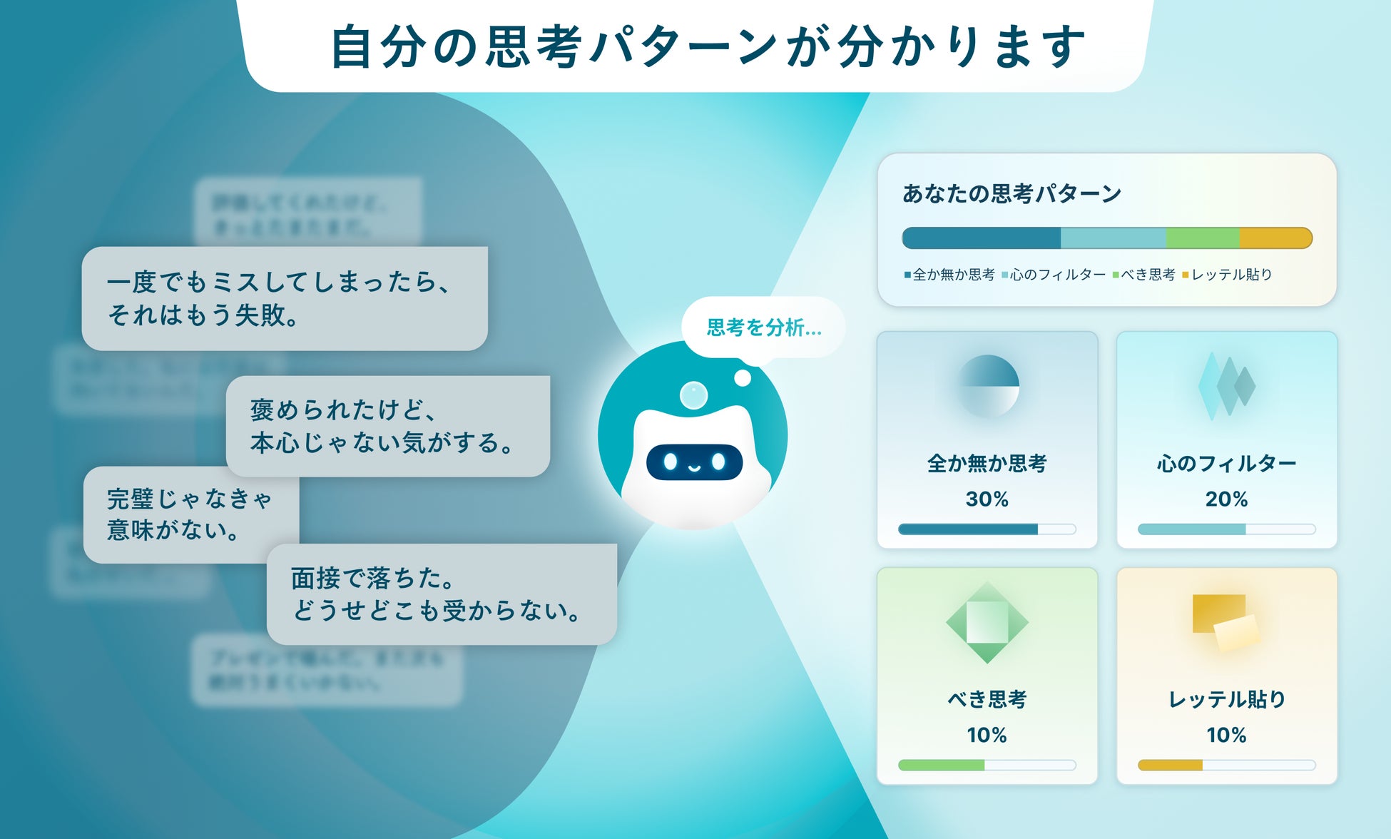 メンタル特化AIが自己理解をサポートする「AIじぶん分析」シリーズ第四弾。心理学の理論を参考に設計された10種の思考パターンを、ストレスや不安の悪循環から抜け出すための第一歩として活用できる新機能。