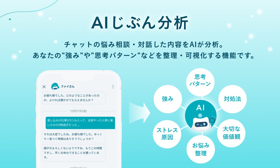 ユーザーが日々の中で抱える悩みや思考の記録をもとに、アウェアファイが提供するメンタル特化AI「ファイさん」がその人ならではの特徴や傾向を分析し、その結果をグラフィカルに可視化することで自己理解をサポートするシリーズ機能です。話すことで気持ちが整理されたり悩みが解決するだけでなく、自分の新たな一面に気づくことができる体験を提供します。これまでに、以下のような機能をリリースしてきました。