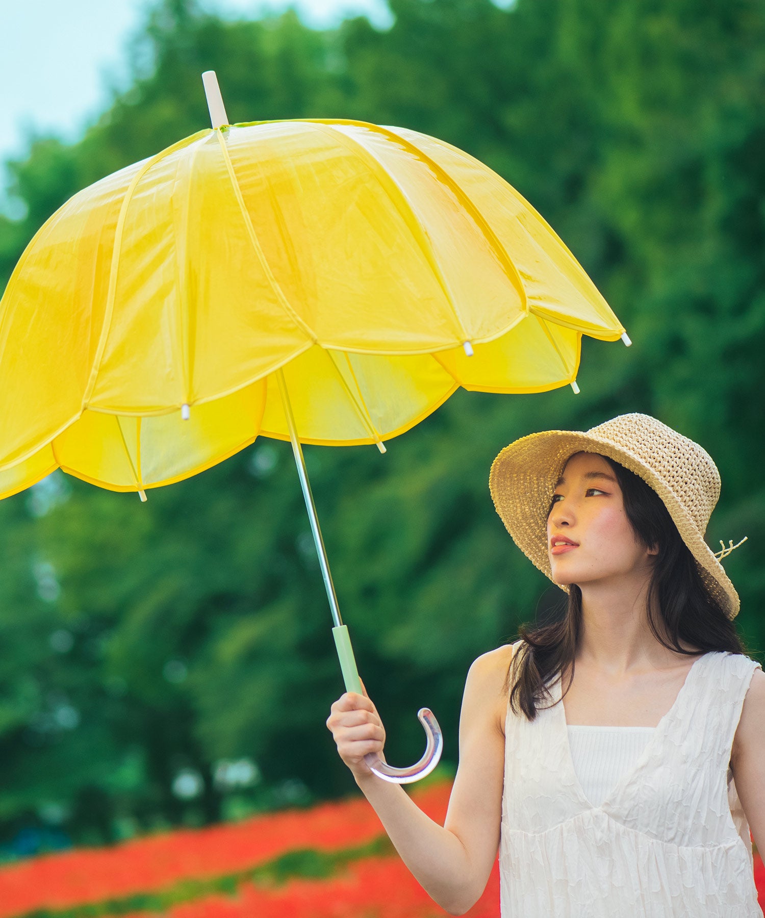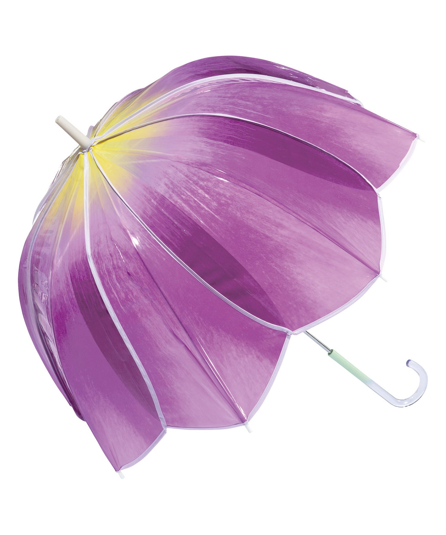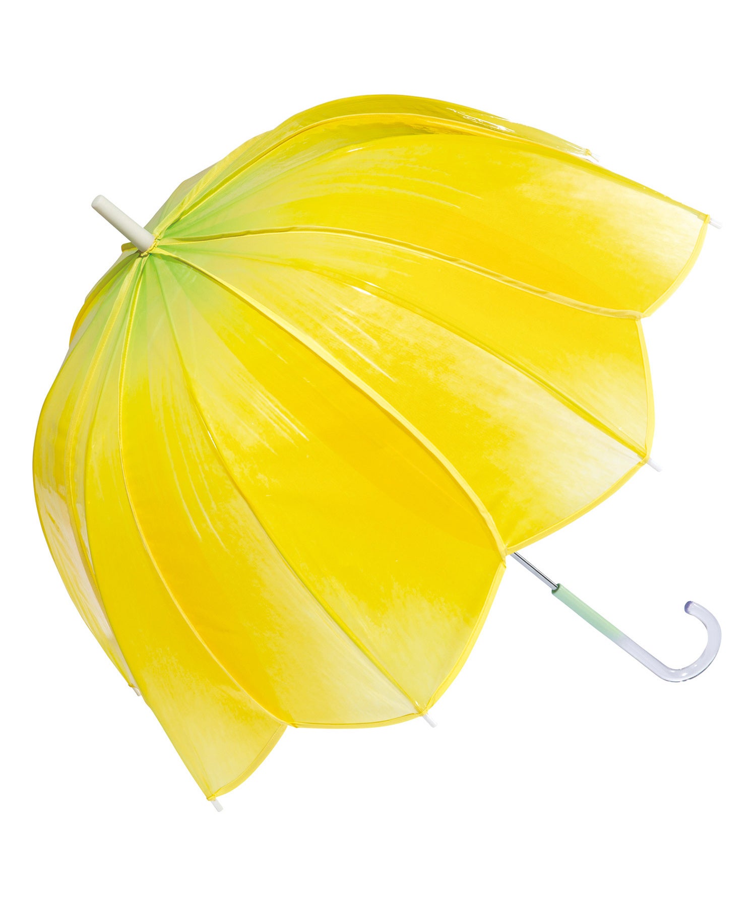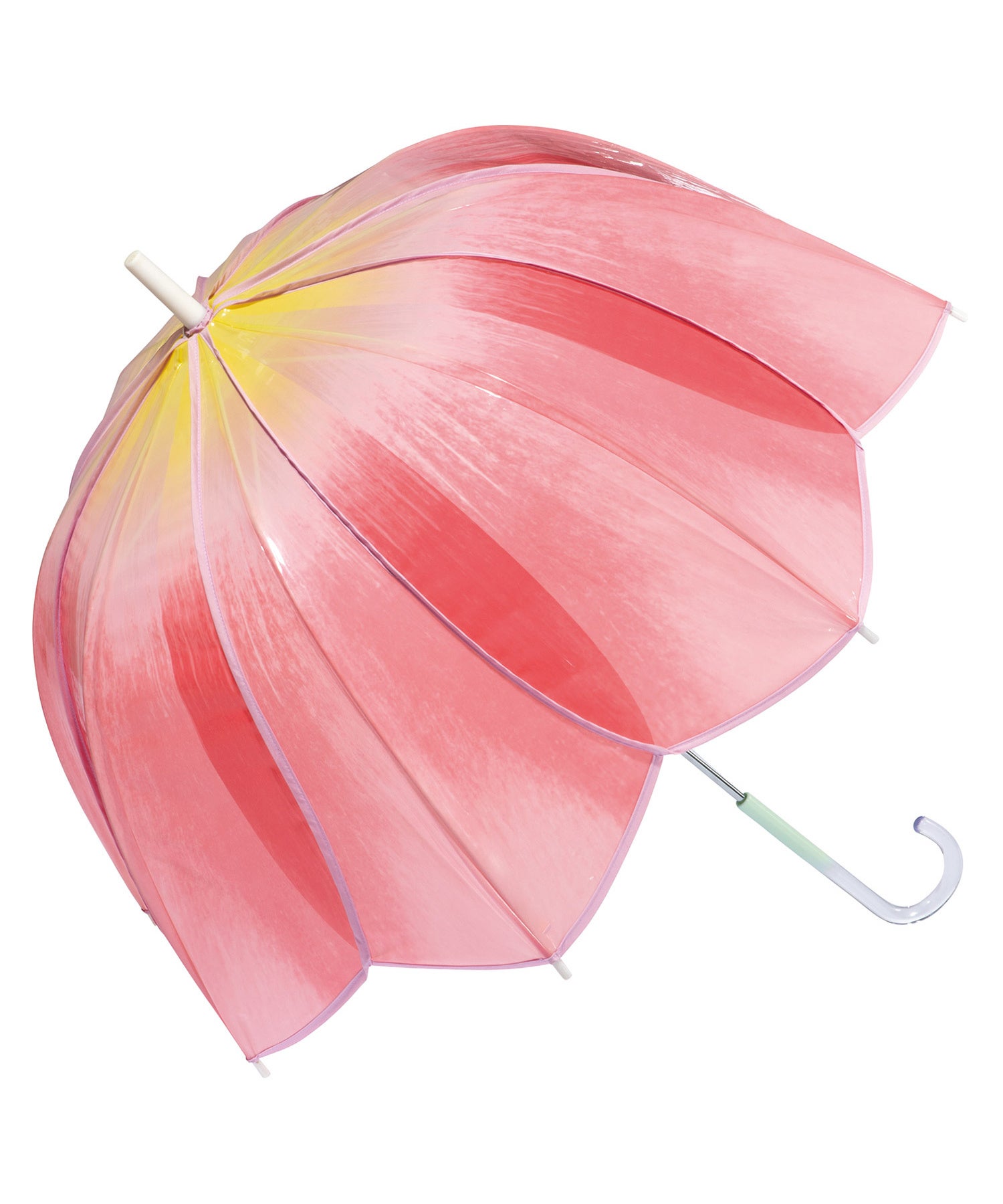 花びらの色や花脈をグラデーションで忠実に再現し、丸みのある可愛らしいフォルムで仕上げた「チューリップアンブレラ」。持ち手にも茎をイメージしたグリーンを取り入れています。