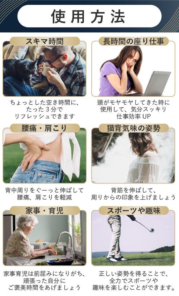 【Swedish Posture Back Stretch】は、「伸ばす・広げる・ほぐす」の3動作を効果的に行うことができます。