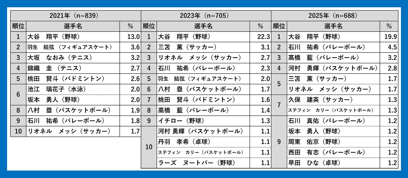 最新の調査は2025年6~7月に実施。青少年(12~21歳)の「好きなスポーツ選手」調査結果で、282名の名前があげられた中、1位が大谷翔平、2位が石川祐希、3位が髙橋藍であることが分かりました。性別、学校期別でも大谷翔平が圧倒的1位となりました。