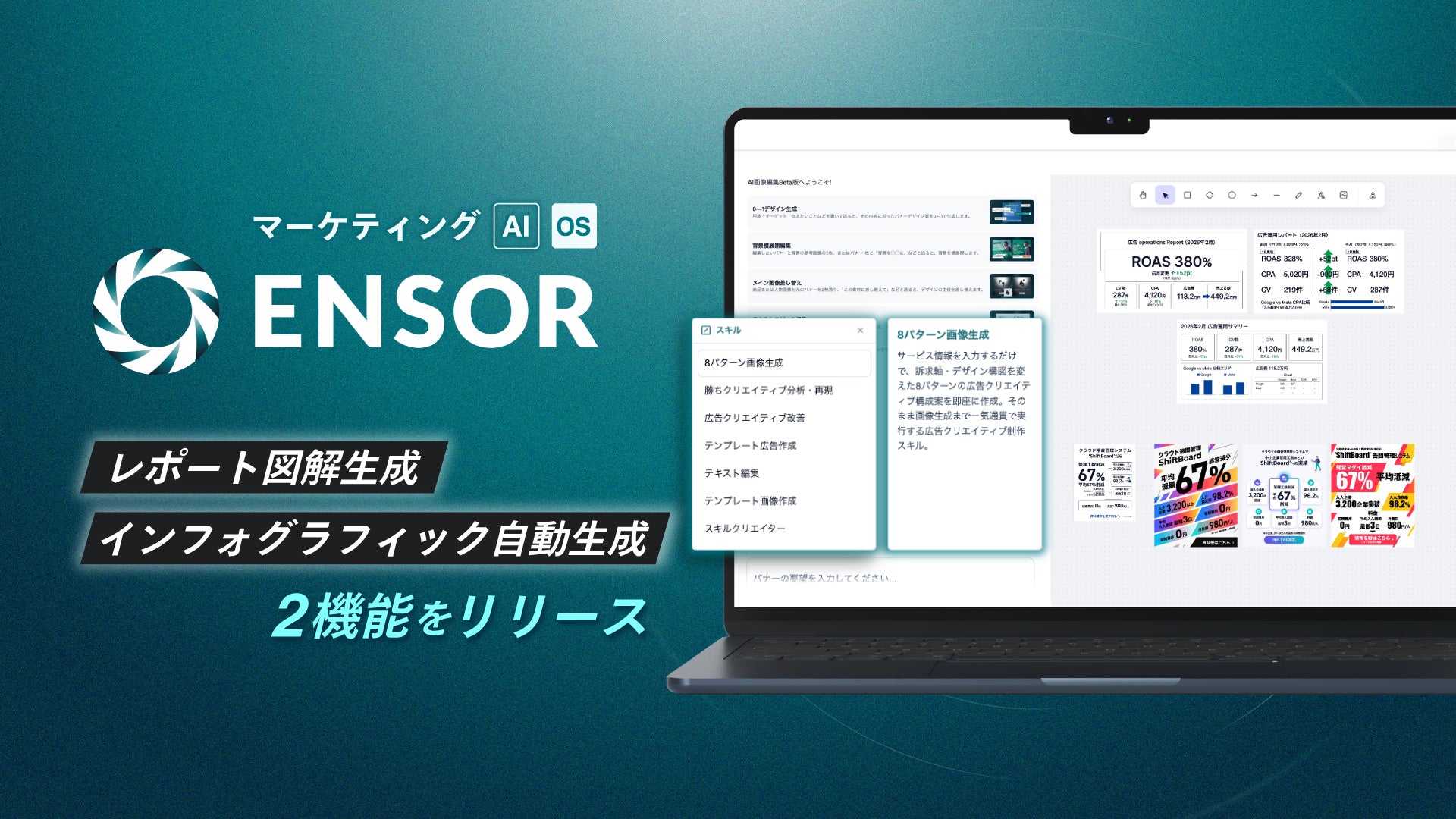マーケティングAI OS「ENSOR」、レポート図解生成・インフォグラフィック自動生成の2機能をリリース ── 広告レポートのデータ入力から、図解とインフォグラフィックをそれぞれ4パターン即出力
