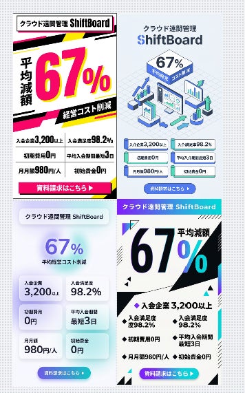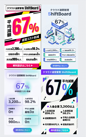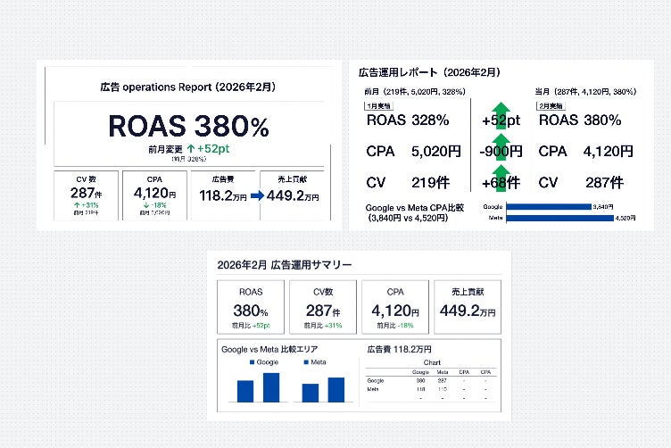 広告レポートの分析データや数値を入力するだけで、レポートの要点を整理した図解ビジュアルを4パターン自動生成します。社内報告・クライアント向け資料・社内勉強会など、説明・共有の場面での利用を想定しています。