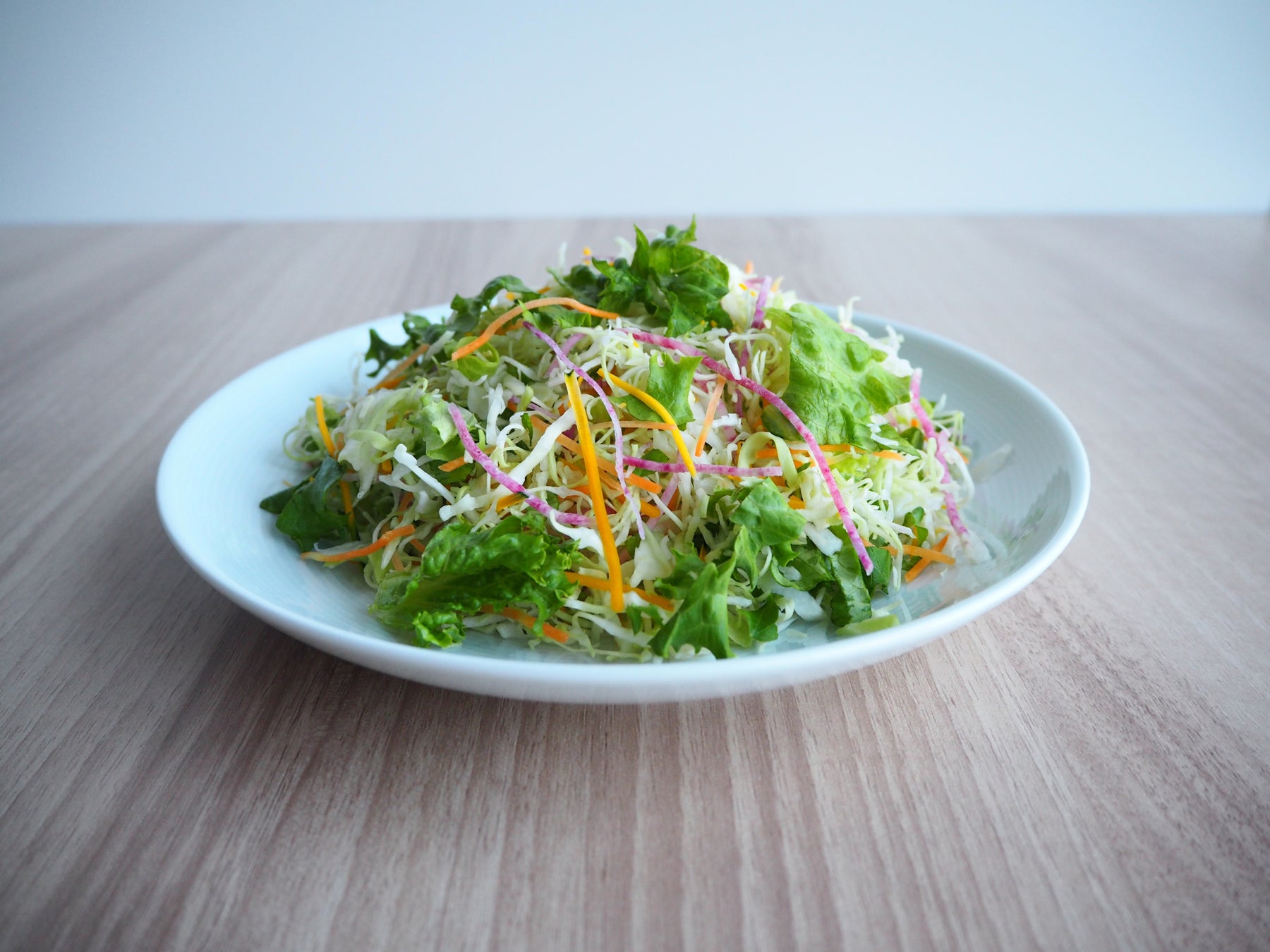 5分で簡単に作れるので、野菜でもう1品ほしいときにもおすすめです。ごまドレッシングの甘味と、しば漬けの酸味がアクセントになる和風サラダです。