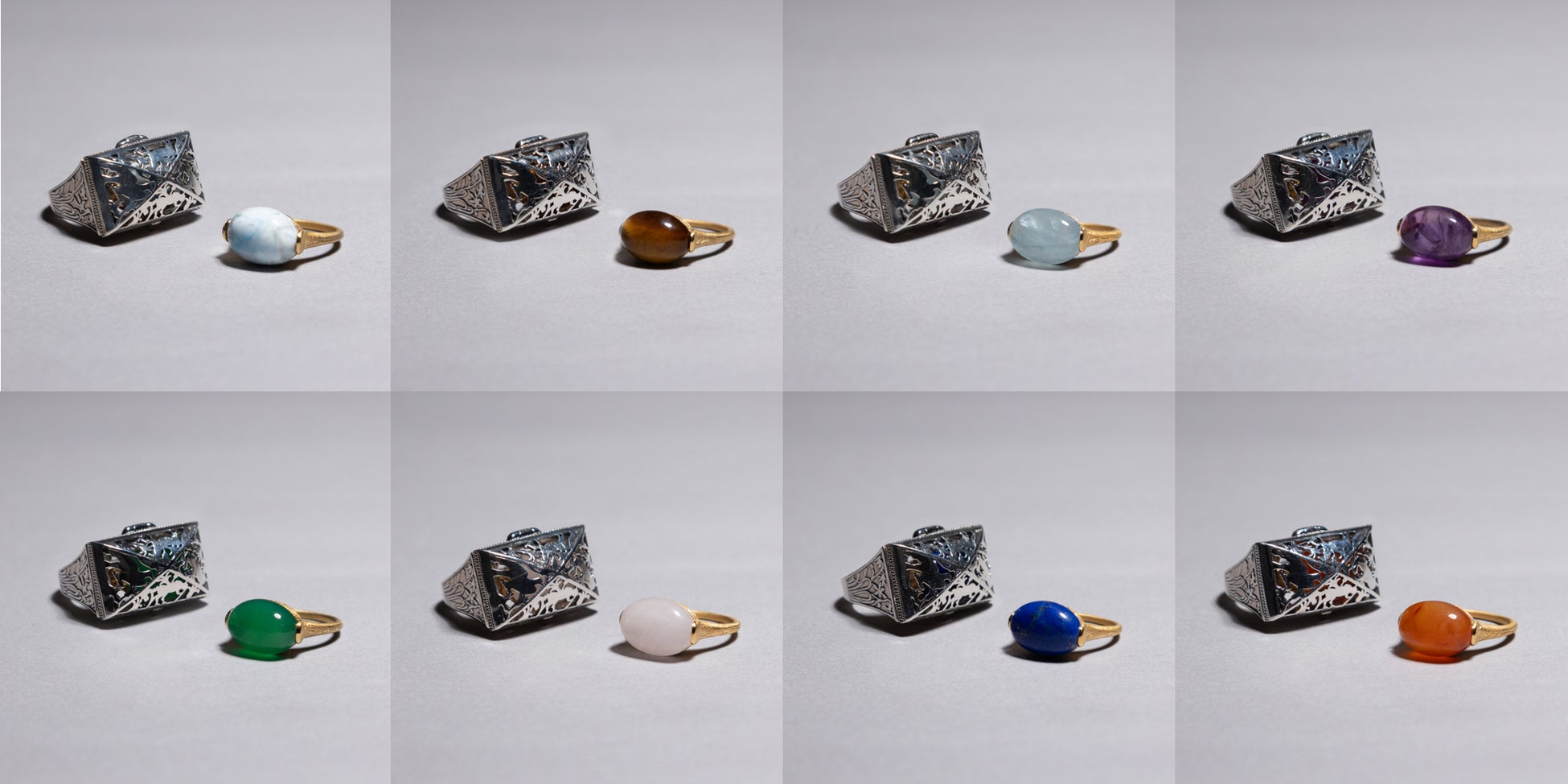 ROKUZANが細部にまでこだわりデザインしてきたジュエリーは数多く、その豊富なデザインを実現するために世界各国から買い付けてきた天然石の中には、形状や内包物によってジュエリーのデザインに合わずデッドストックになってしまうものもあります。それらの天然石を使用して制作したのが「Treasure box ring」です。PASS THE BATONのシンボルである「バトンを持った動物たち」のシルエットを型抜きしたリングの蓋を開けると、中にはデッドストックの天然石を用いたもう一つのリングが姿を現します。一つひとつ表情の違う天然石だからこその個性をお楽しみください。