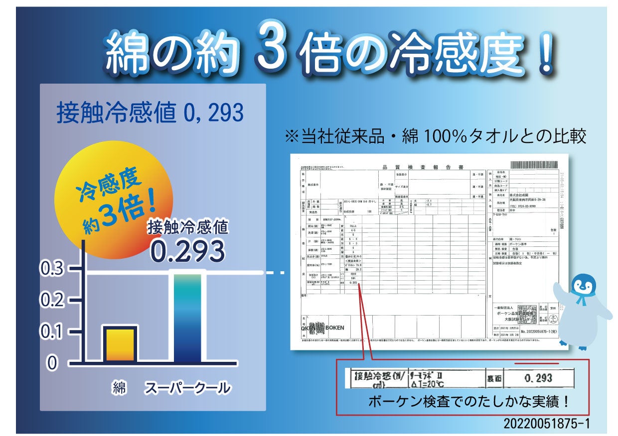 クール糸®を、通常よりも多く使用することにより、接触冷感の自社基準値 0.2をクリアした、0.293という数値に。綿との比較で【約3倍の冷感度】というとっても冷たい素材なんです!だから触るだけですぐにヒヤっと冷たいんです!