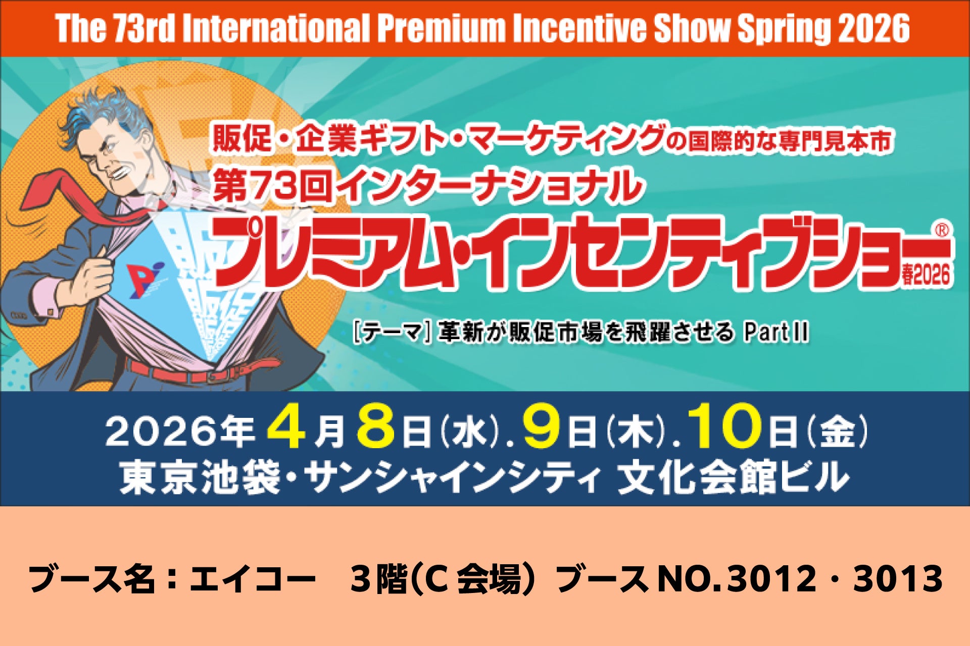 株式会社エイコー(本社:東京都墨田区)は、 2026年4月8日(水)〜4月10日(金)に東京池袋・サンシャインシティ 文化会館ビル コンベンションセンターにて開催される、販促・企業ギフト・マーケティングの国際的な専門見本市「第73回インターナショナルプレミアム・インセンティブショー春2026」(主催:株式会社ビジネスガイド社)に出展することをお知らせいたします。