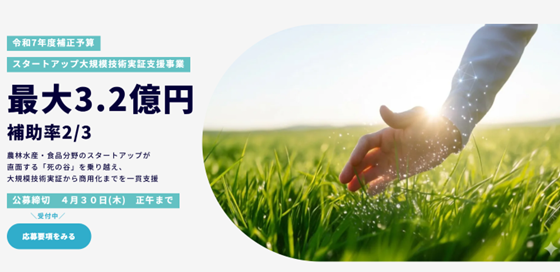 農林水産・食品分野におけるスタートアップの大規模技術実証に向けた補助事業、3月31日(火)公募開始